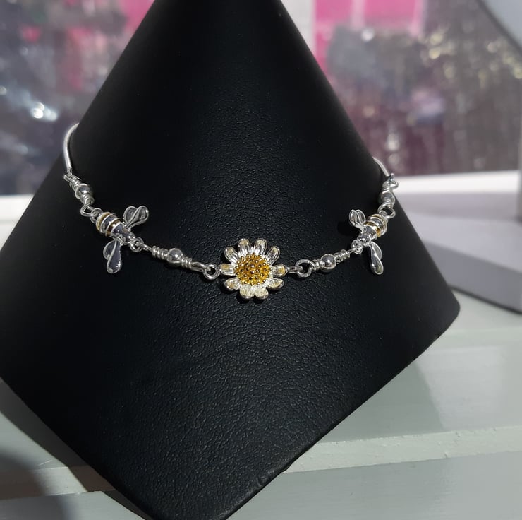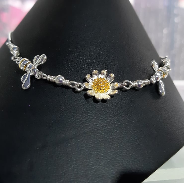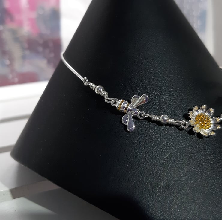 This gorgeous bracelet matches my Daisy and Bee Necklace and Earrings, and could be worn every day for a lifetime. Two plump bumble bees are competing for the central daisy. It is made from sterling silver with the daisy stamen picked out in gold-plating and stripes of the plump bumble bee's body, linked with sterling silver wire and sterling silver beads, the bracelet part is a snake chain with a slider, making it completely and easily adjustable. It can be worn from 4 to 10 inches, finished with a lovely little dangle.