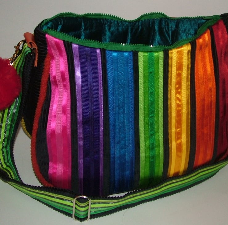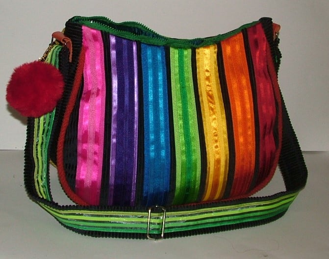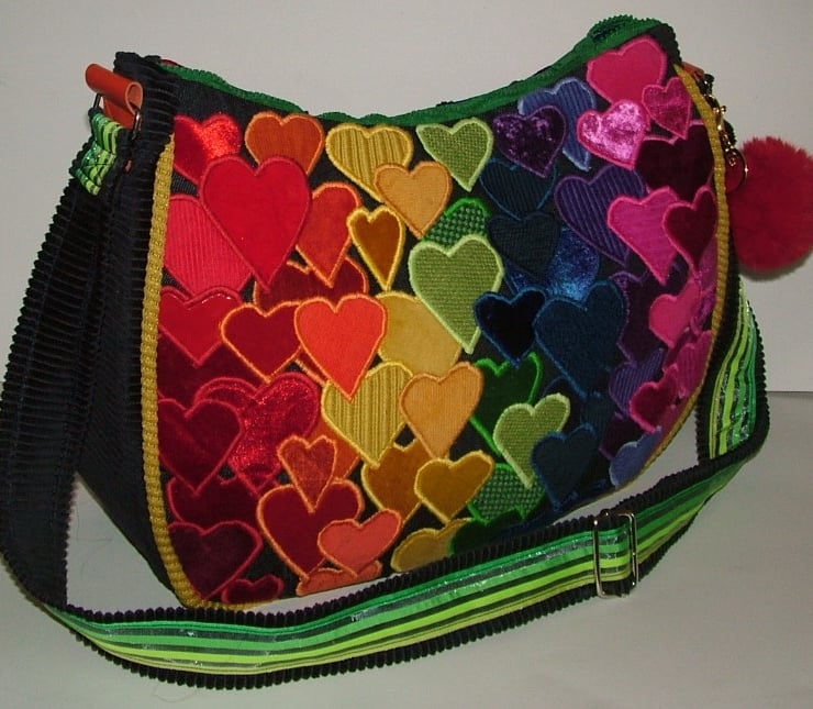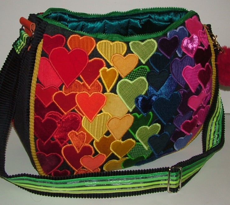 Large handbag featuring lots and lots of hearts in many colours and textures arranged in rainbow order to create a really happy handbag