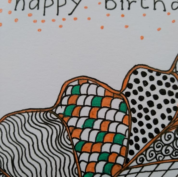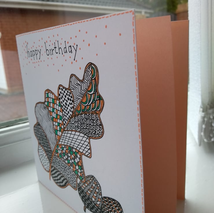 A completely handmade uniquely designed card. Consisting of an oak leaf and two acorns hand drawn in black ink. Coloured with glitter gel coordinating colours. All on quality pristine white card.