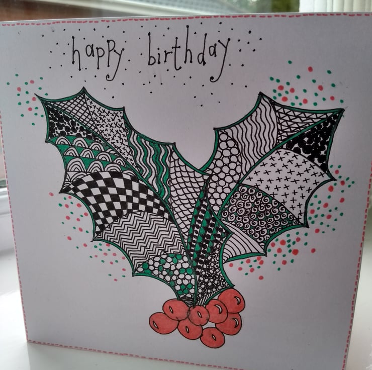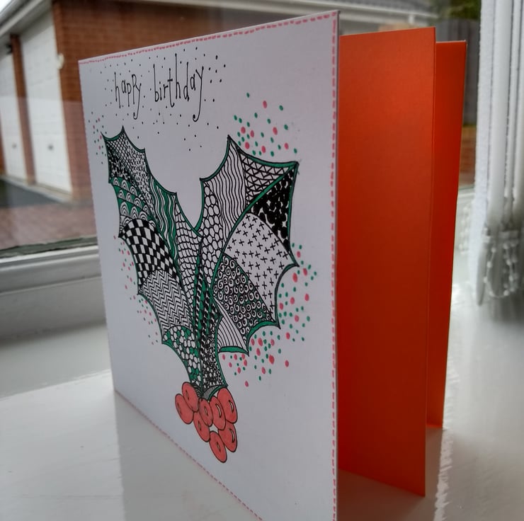 a completely handrcoupage and uniquely designed card. Consisting of pristine white quality card which has had a design of Holly leaves and berries hand drawn in black ink. Hand coloured with glitter gel in orange and green. Finished off with happy birthday hand written
