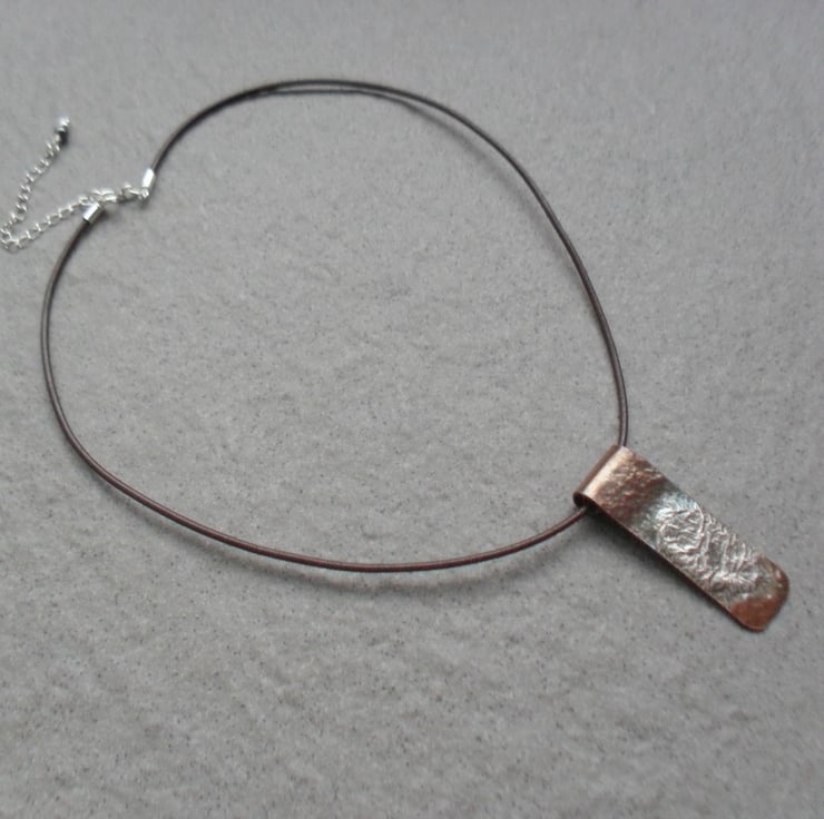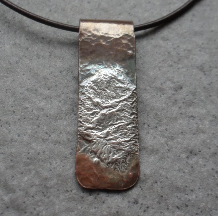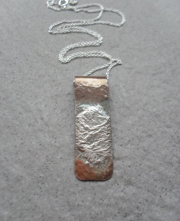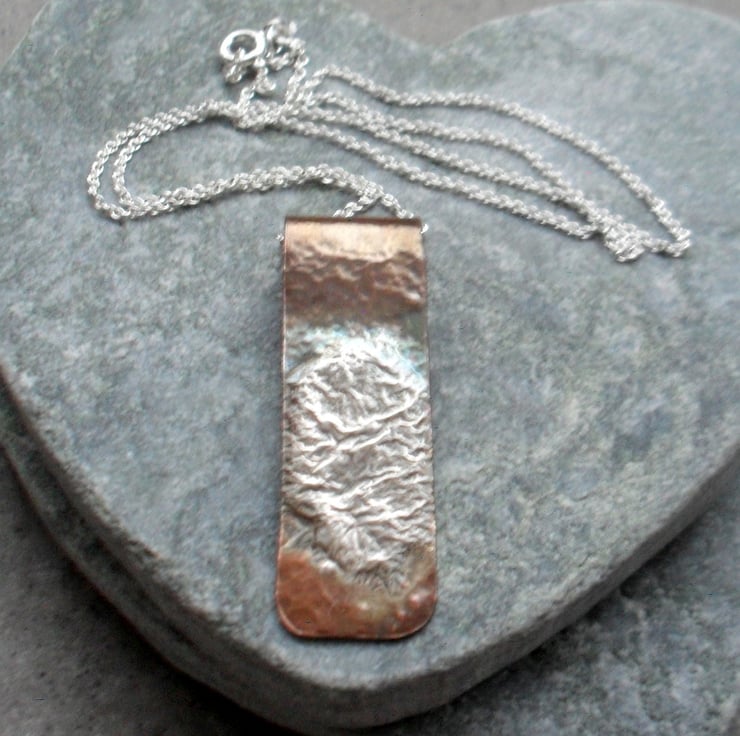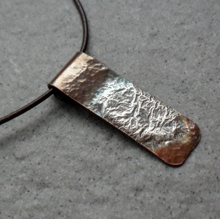 Copper bar pendant has been cut from a sheet of copper ,sanded, Stamped to give texture and has sterling silver melted on the top then oxidised to give an aged look. the back of the pendant has had a coat of lacquer with the front being left in its natural state. The copper is a lovely brown colour with shades of blue as the copper moves in the light