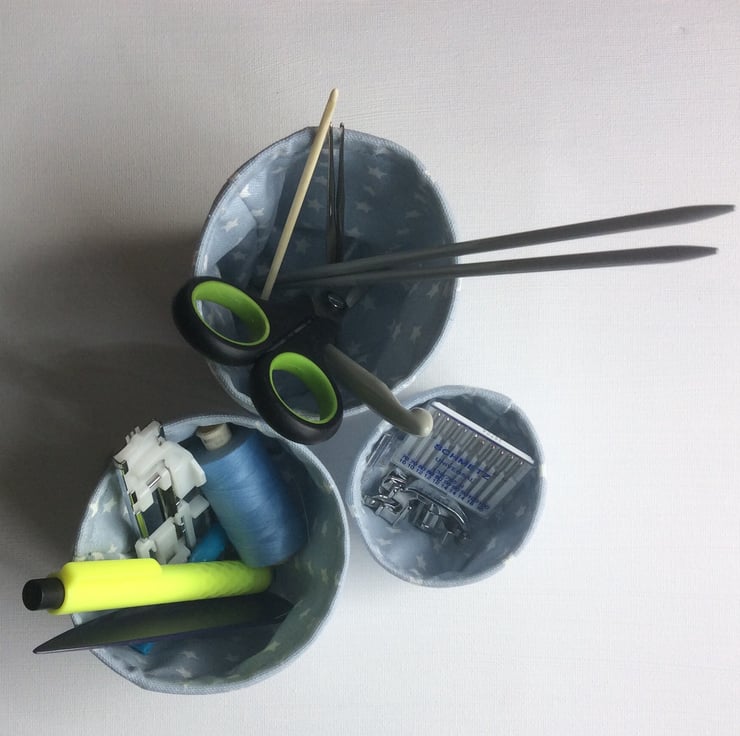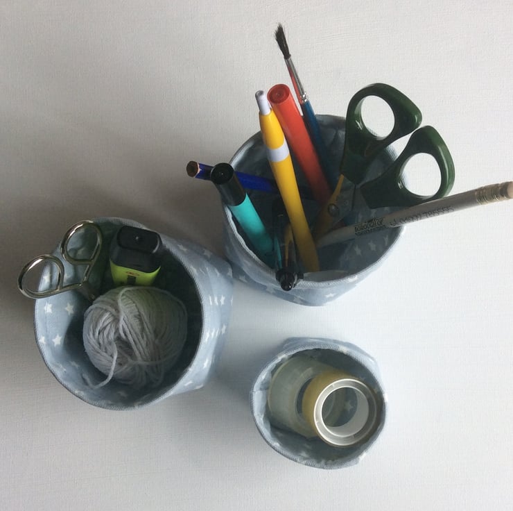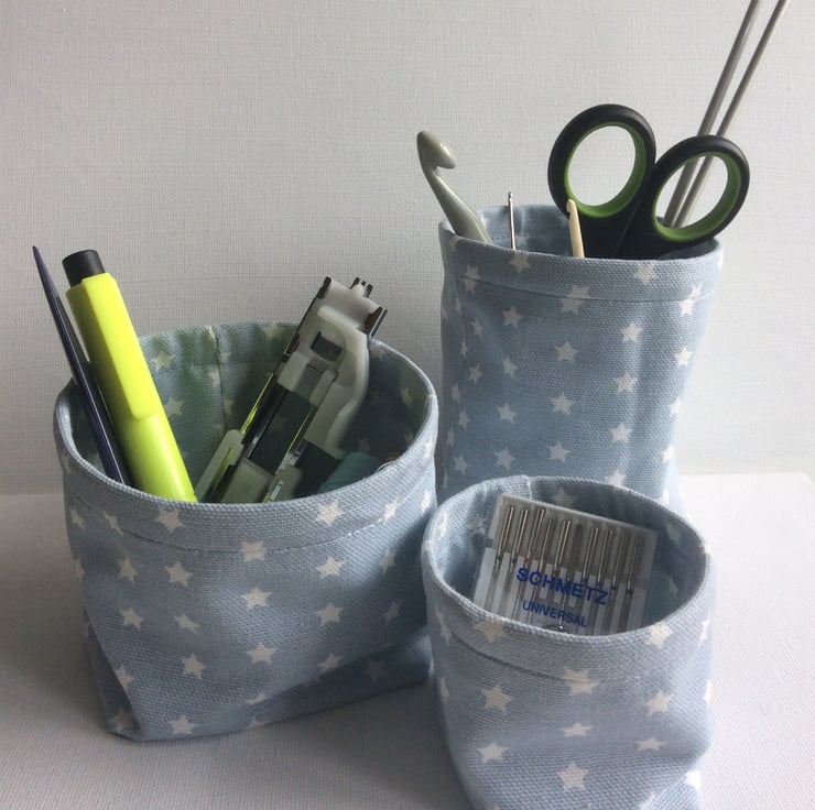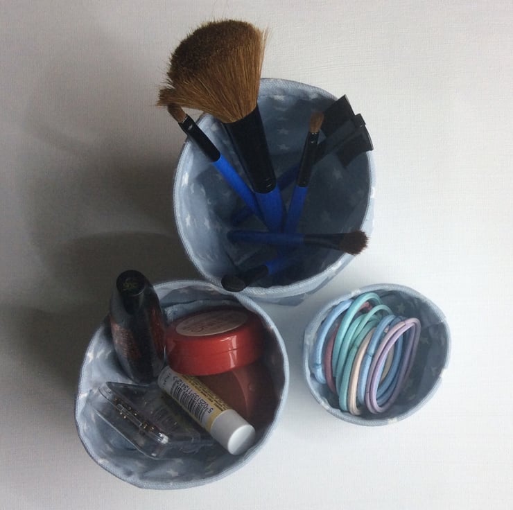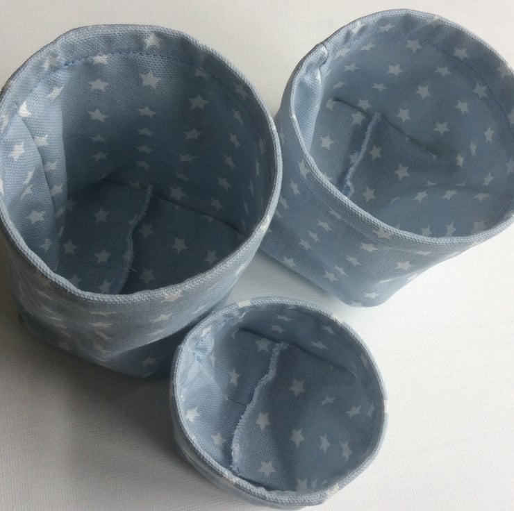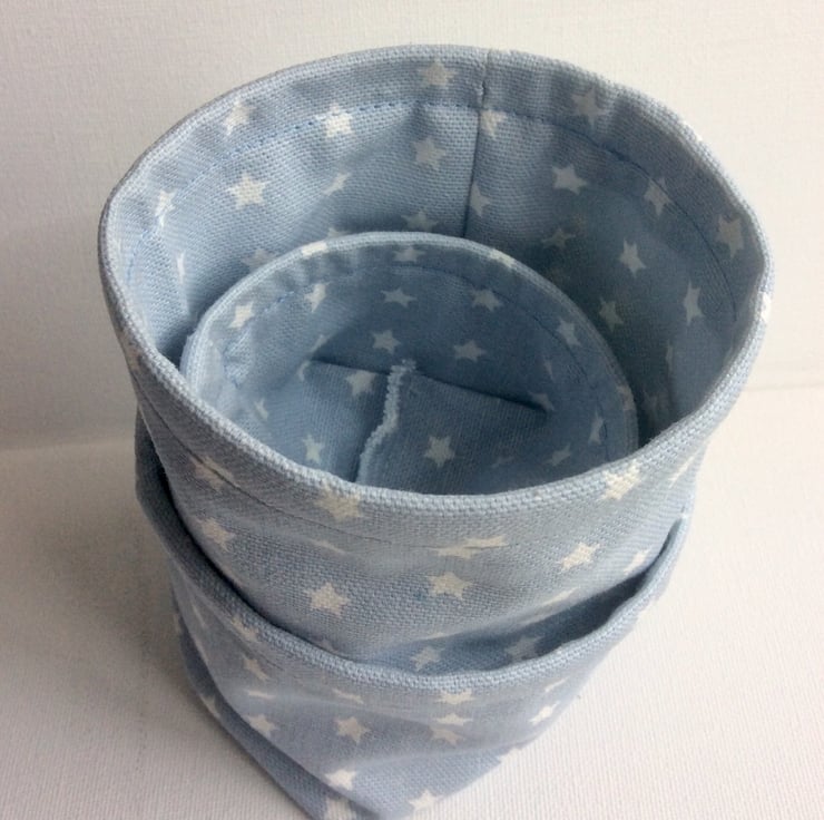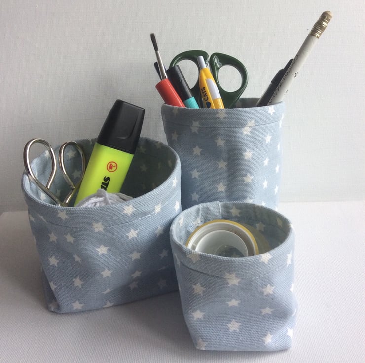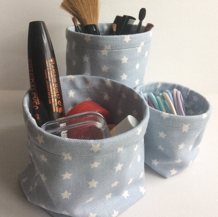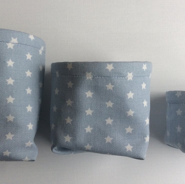 A set of three small fabric bowls/baskets made using a light blue, linen look cotton fabric with small white stars. The bowls could be used to store a multitude of things ( except anything liquid!). Use in the bedroom, on your desk or for your crafts, for those small objects that are always going missing.