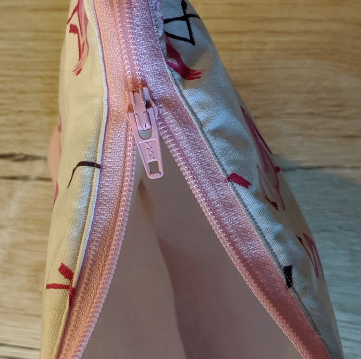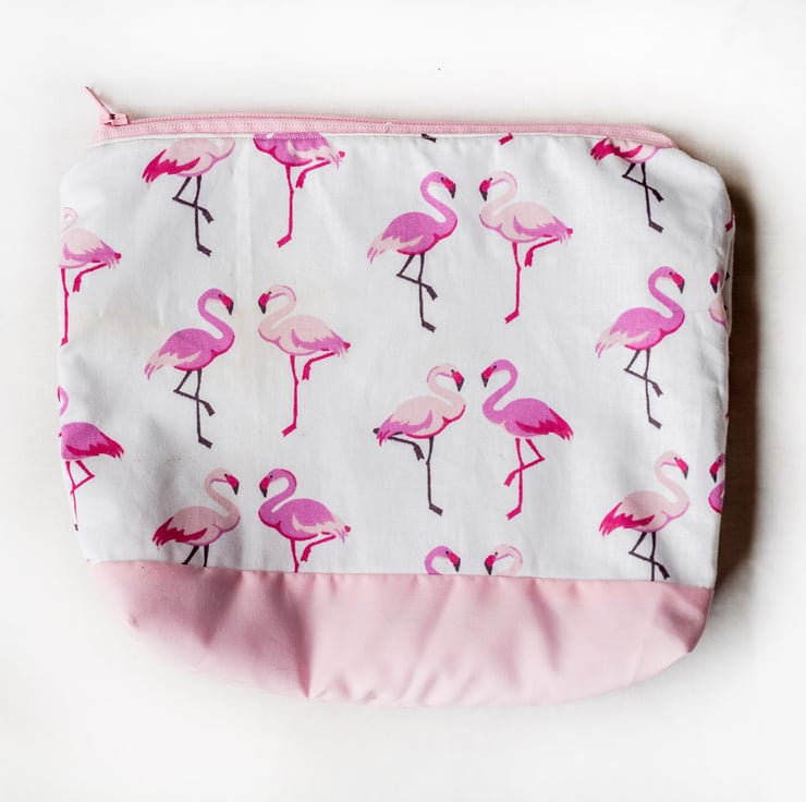 Fun makeup bag with a tropical flamingo print. Fully lined, with zip closing, made of 100% cotton. It's made with interfacing to stiffen the fabric, so it holds its shape better and can stand up. Perfect for carrying makeup, toiletries, or accessories, at home or on holiday.