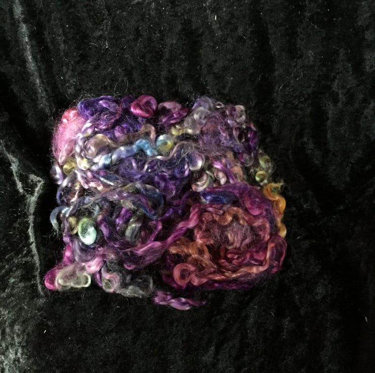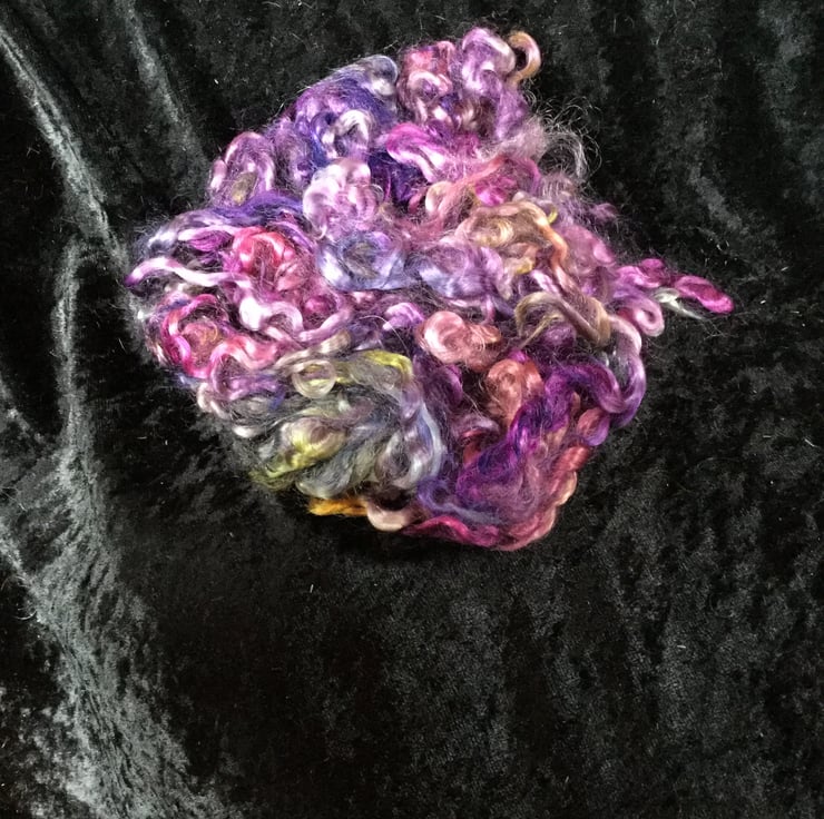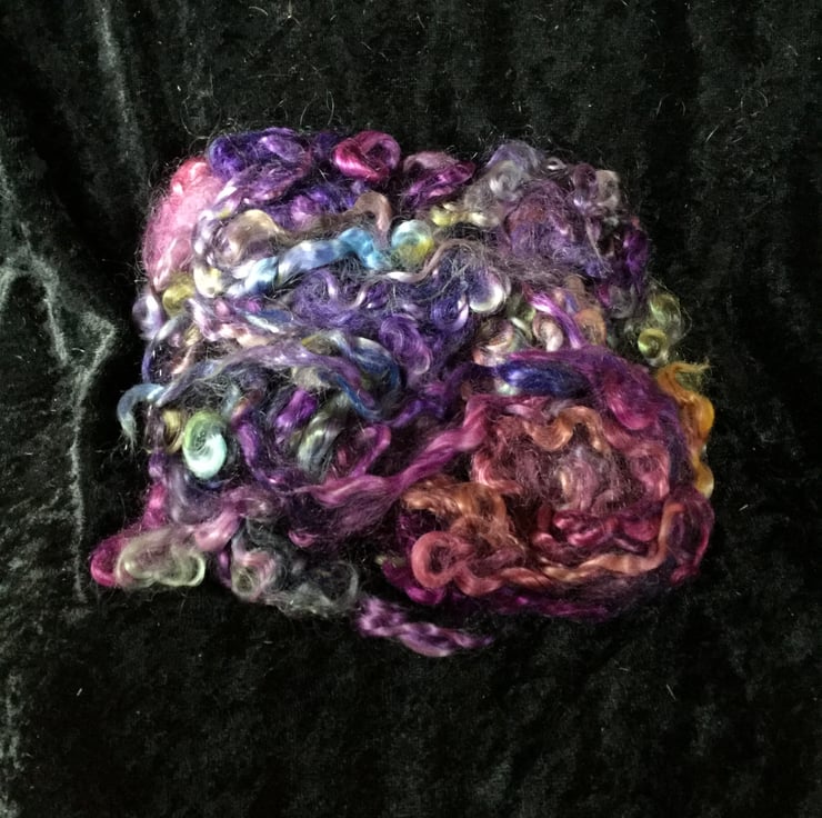 Mobair Kid Mohair locks hand dyed by Victoria in random pinks, purples, burgundy, yellow green, turquoise.