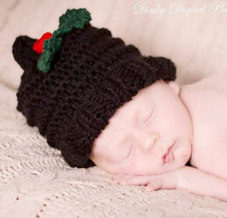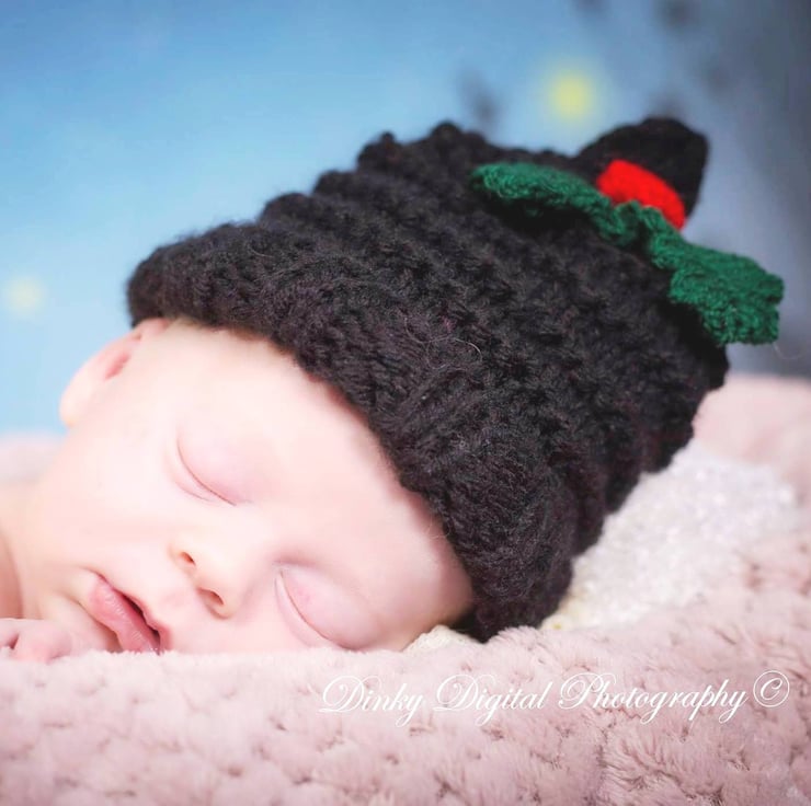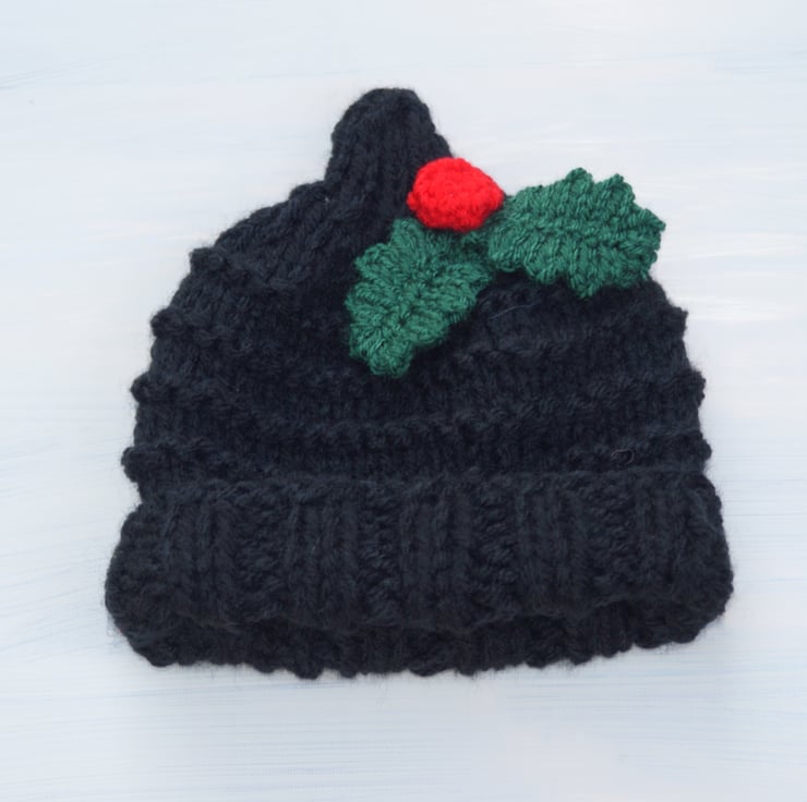 This delightful hat is made in 100% acrylic in black with bright red crochet berries and green leaves. It has a turn up brim.