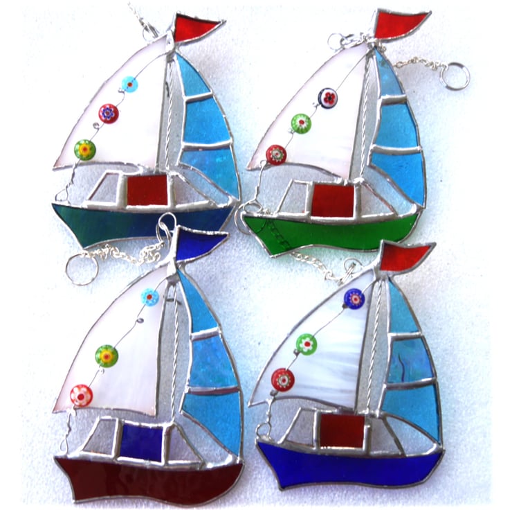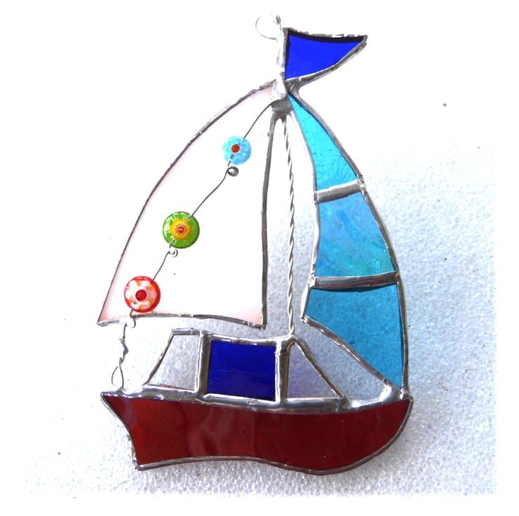 It is a gorgeous little boat with a bright coloured hull. It has a little differently coloured flag and a matching cabin which has clear glass windows, a bright turquoise sail which includes some very shiny iridescent glass and a white sail which is decorated with 3 little beads, as flags, in bright colours to match the boat.