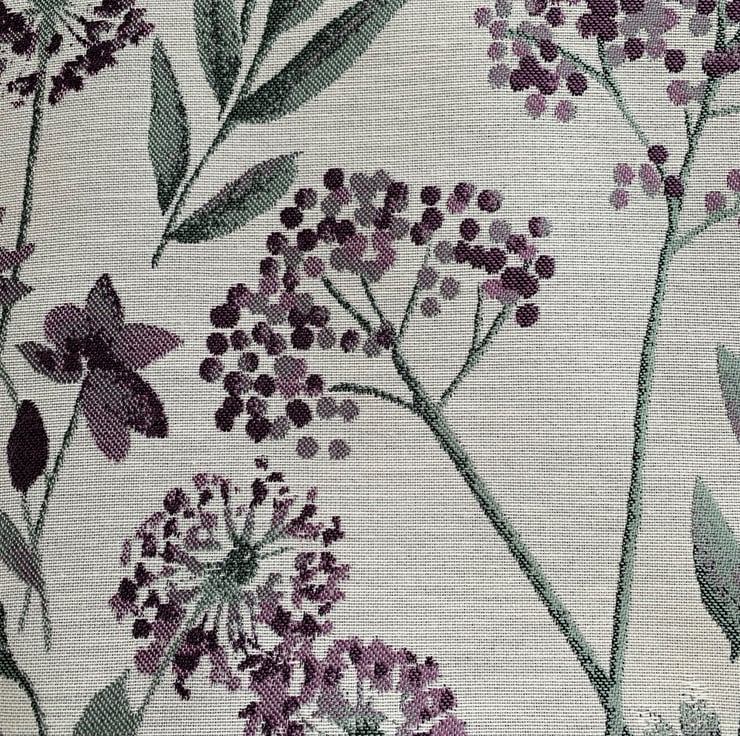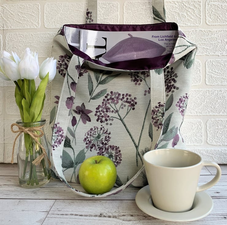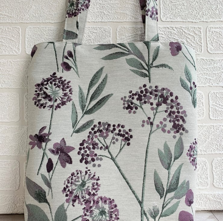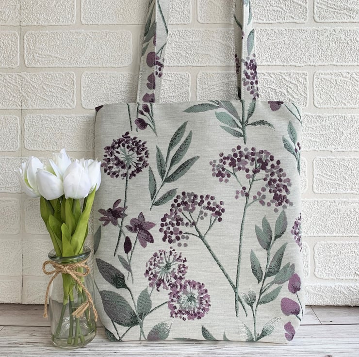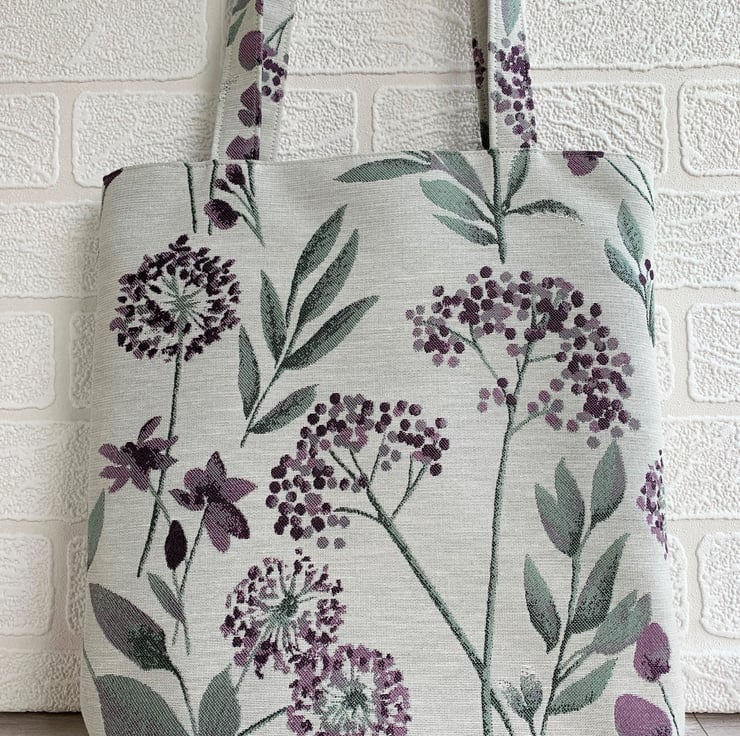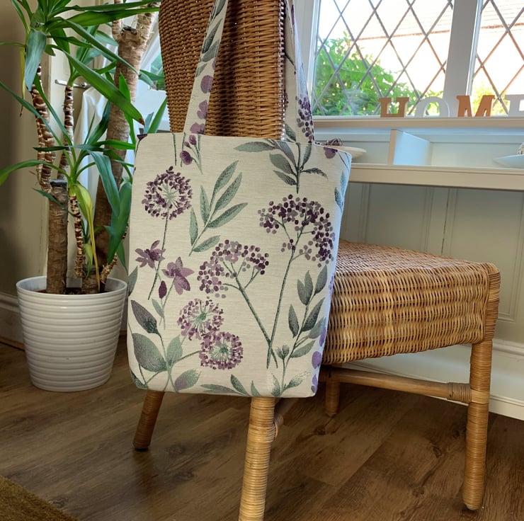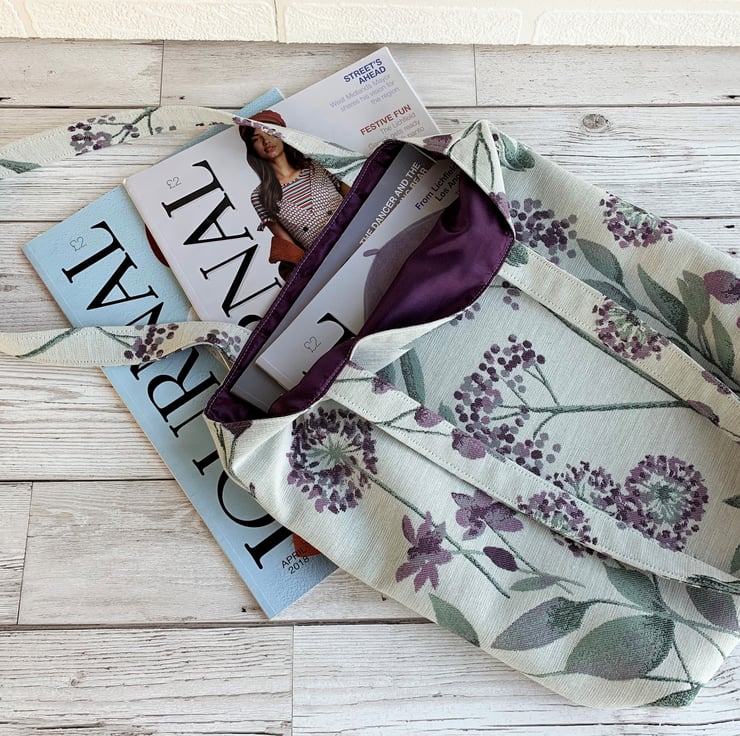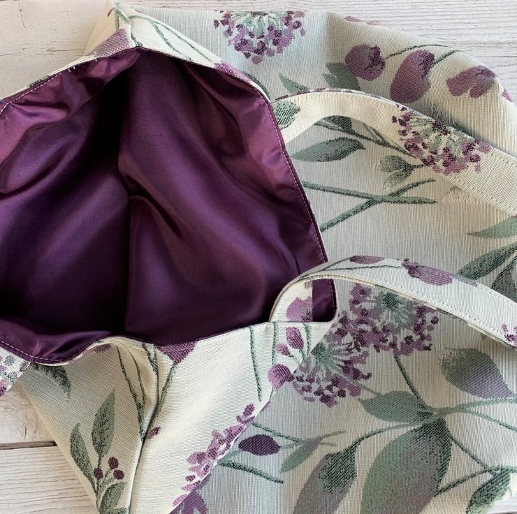 A handy tote bag in a pretty floral fabric. The beautiful pattern in the weave of the fabric features purple alliums and other purple flowers, with jade green leaves on a cream background. The bag is fully lined with a rich plum purple satin fabric, which exactly matches the purple of the flowers in the outer fabric.