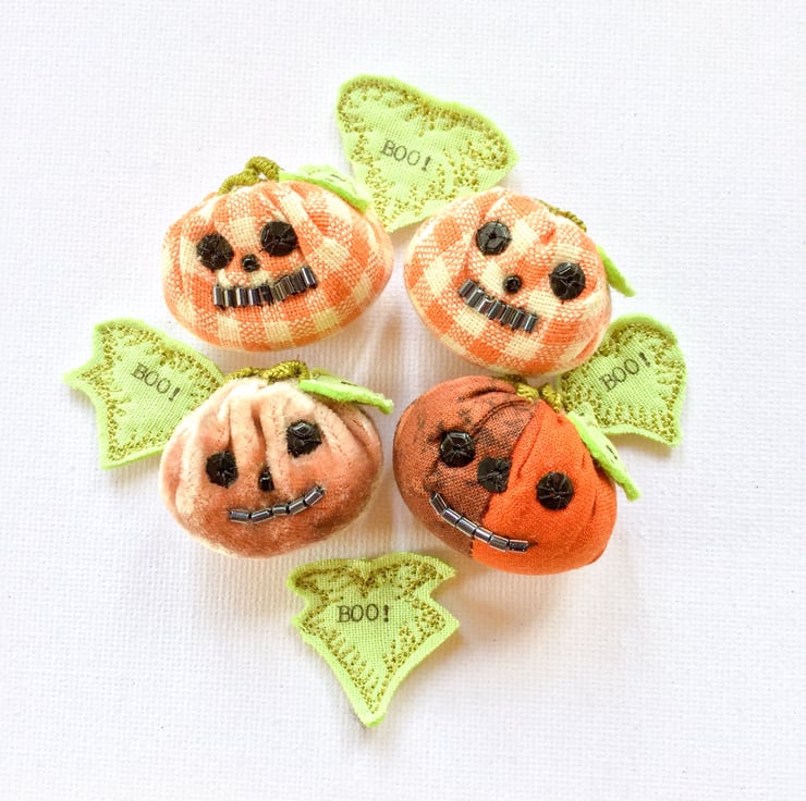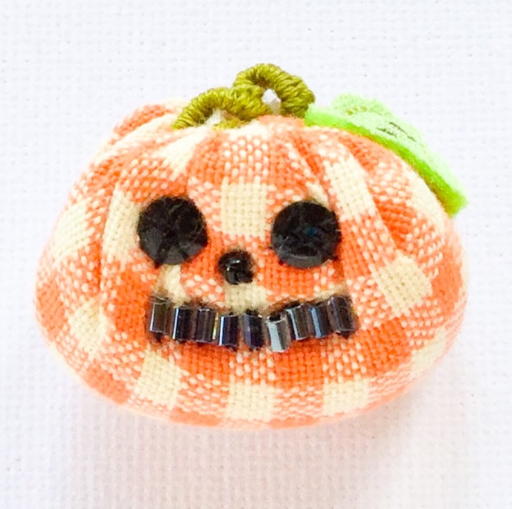 Tiny gingham textile brooch with seed bead eyes and lozenge bead mouth. A hand embroidered stalk and a teeny leaf saying “Boo!” A bit of whimsy for your scarf.