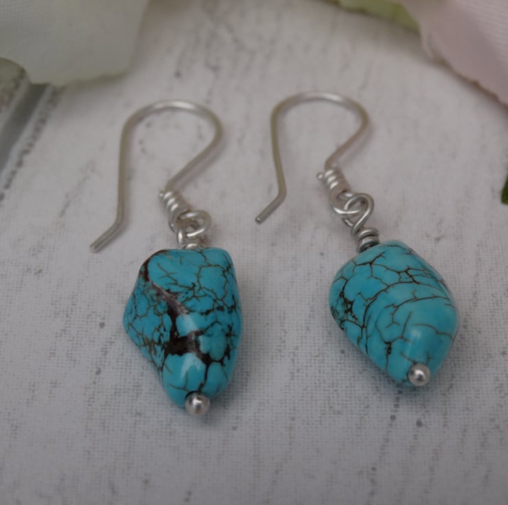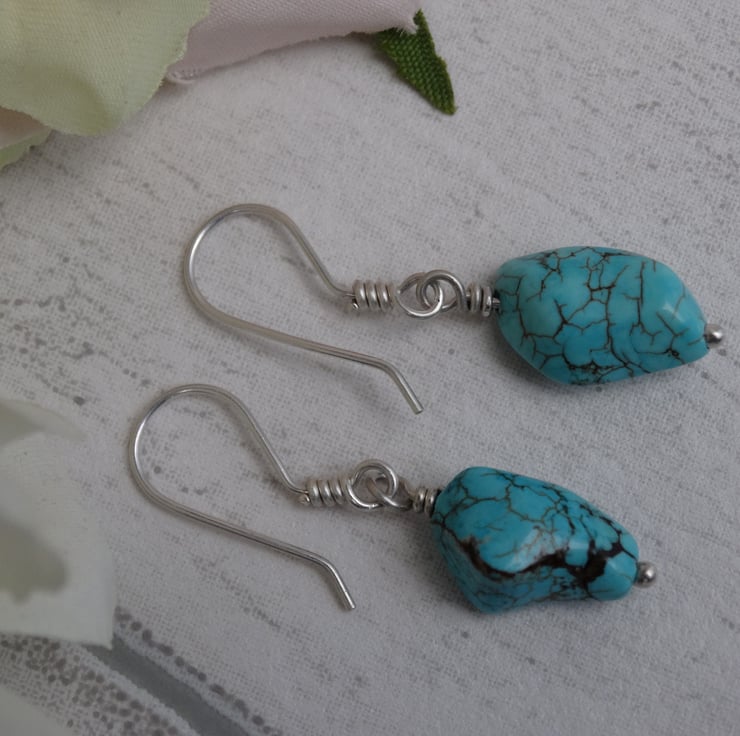 These drop earrings have been made using genuine turquoise crystals and sterling silver.