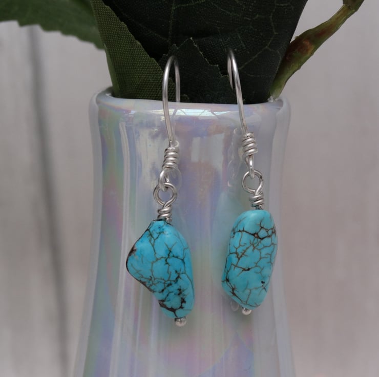 The earwire is handmade using sterling silver wire. From this hangs a 2 cm turquoise crystal nugget.