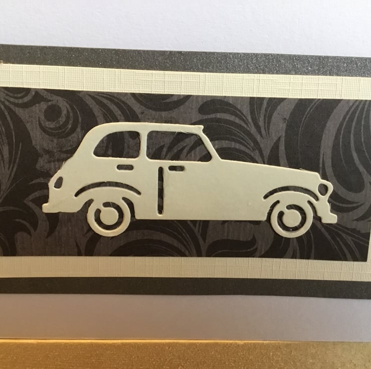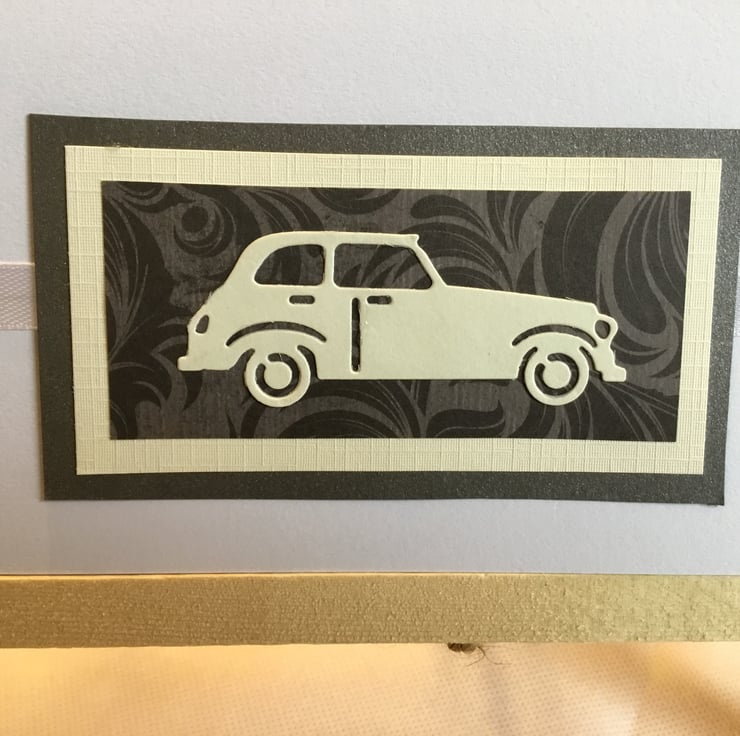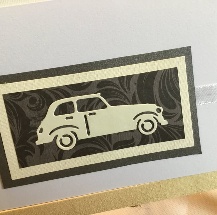 Die cut car in cream topped onto a deep grey background then cream and grey again. Then placed onto a white ribbon band.