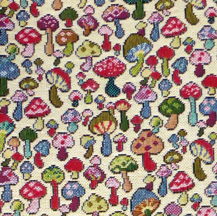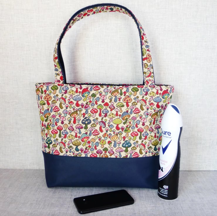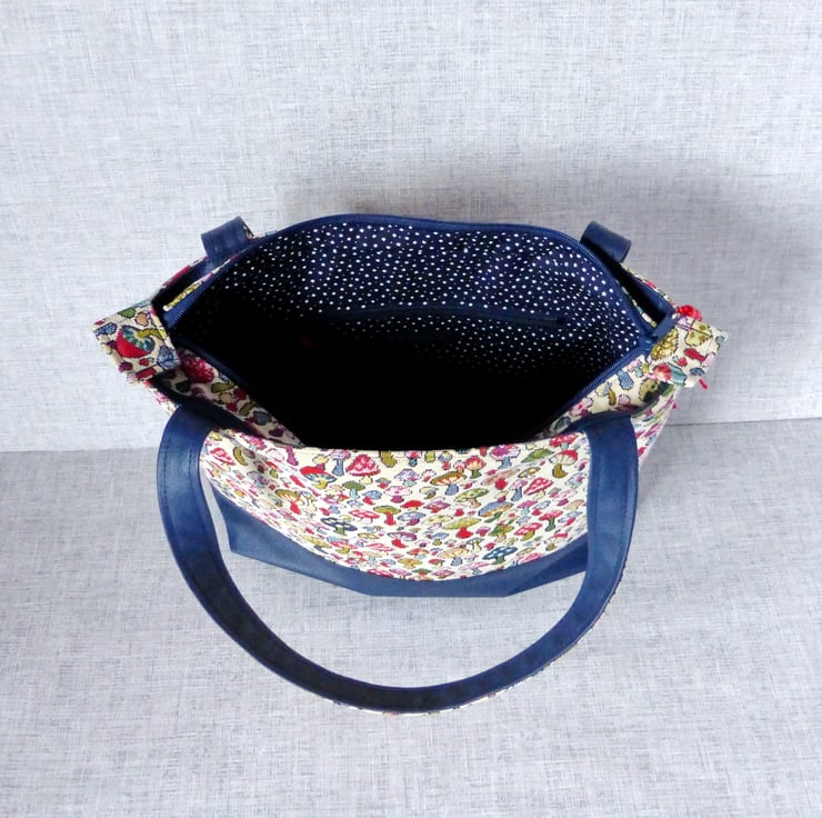 The mushroom design fabric is multi coloured mushrooms/toadstools on a cream background and is 80% cotton, 20% polyester. The lining is 100% cotton in navy blue with a white star design on it and inside the bag is a zipped pocket, plus 2 slip pockets.