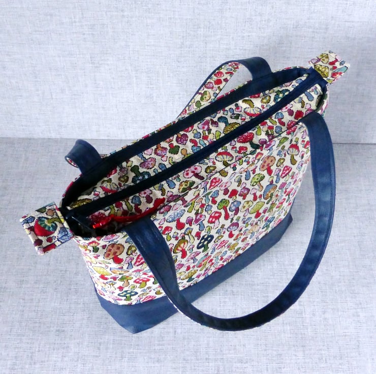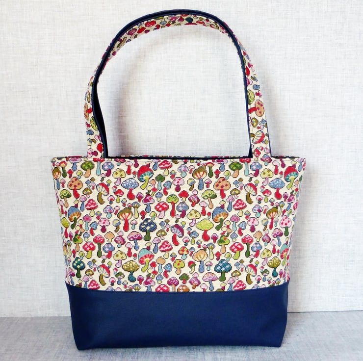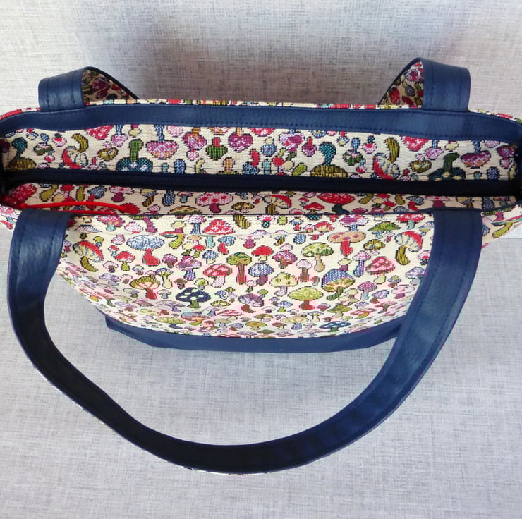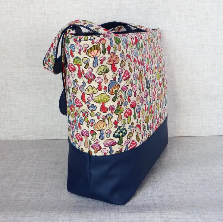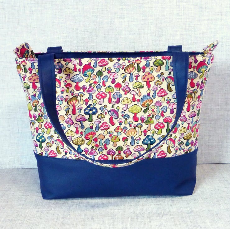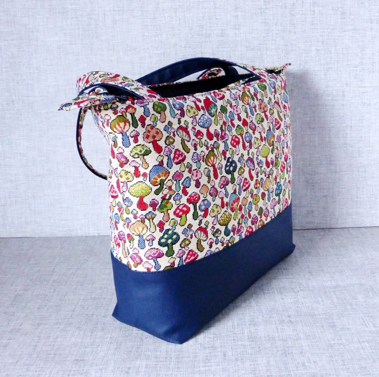 A zipped tote bag/large handbag, made from a tapestry canvas fabric with a mushroom design, and navy blue faux leather.