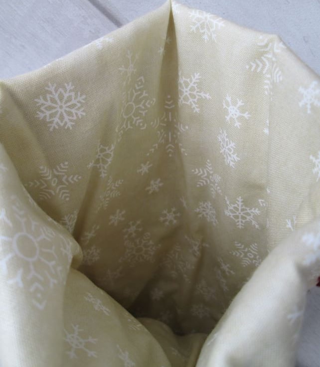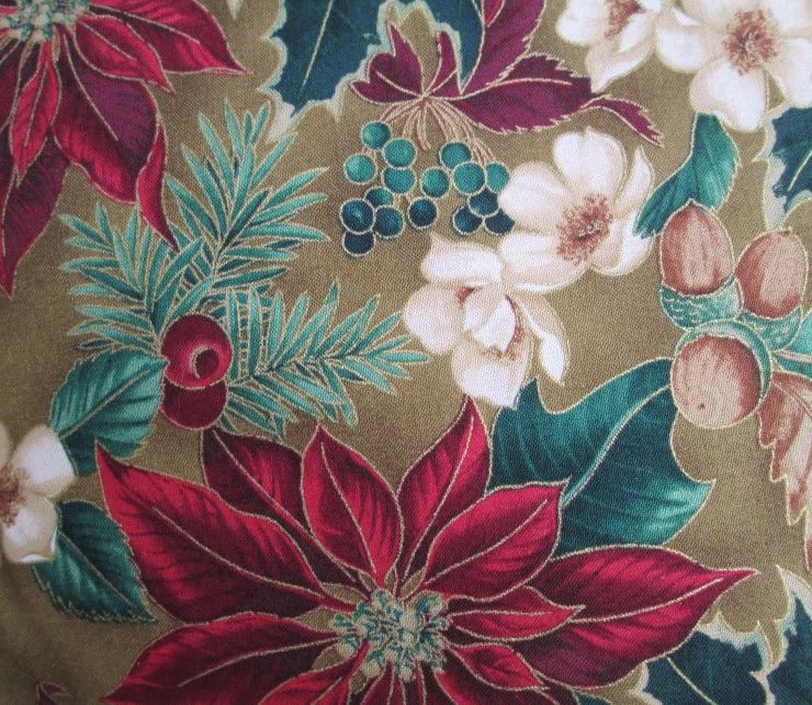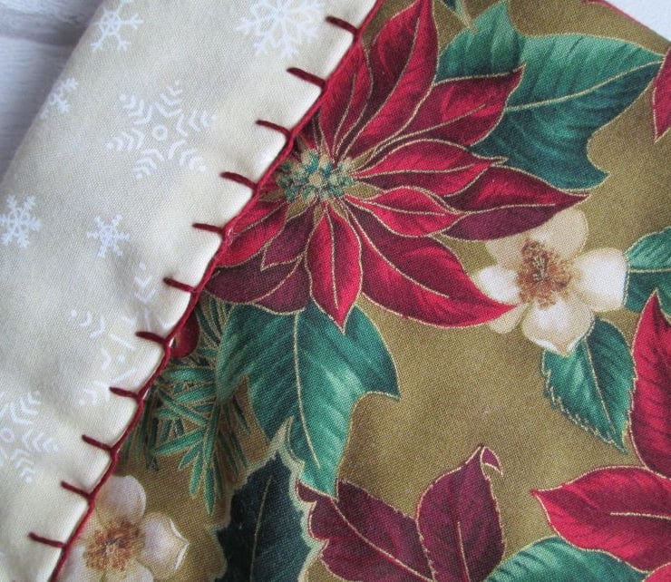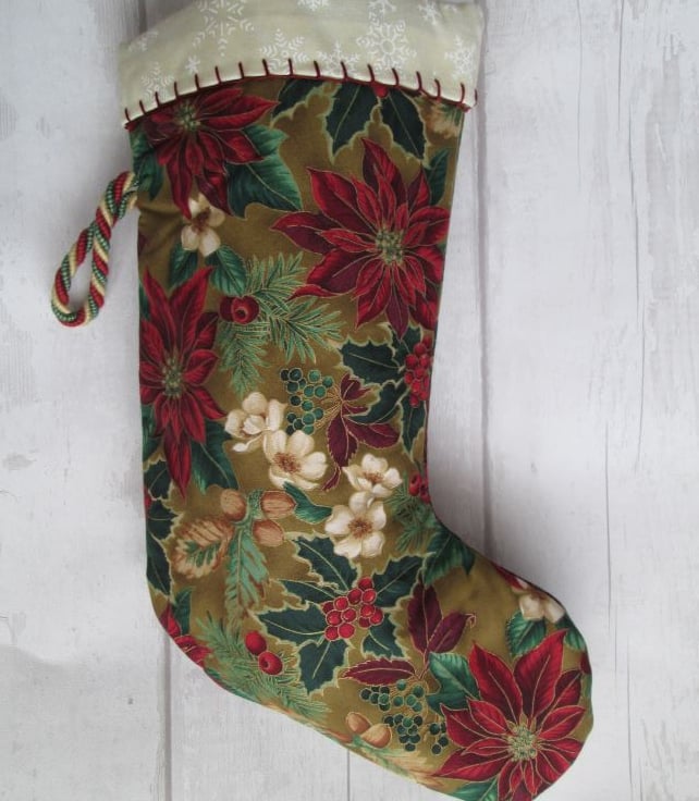 This would make a lovely stocking for a grown up or a keen gardener - an antique gold background printed with beautiful winter flowers and foliage including poinsettia, holly, oak, yew and hellebore (Christmas rose) all picked out in metallic gold. Teamed with plain cream cotton patterned with white snowflakes for the lining and cuff, which is hand finished with crimson blanket stitch. Completed with a twisted cord hanging loop in coordinating red, green and pale gold it would look wonderful hung on a proper fireplace.