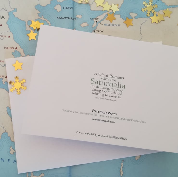 Ah, Saturnalia. That Roman winter solstice festival in which people overindulged, exchanged presents, did silly things under the influence. Sound familiar? This Saturnalia card will bring a smile to your atheist, humbug and classics nerd friends this Christmas! Hopefully. There are only two left in my stock so unless any magically manifest, this is all that's left and I'm phasing out the design, so grab them while you can. The perfect gift for a mythology nerd, classics enthusiast, history academic or Christmas cynic.