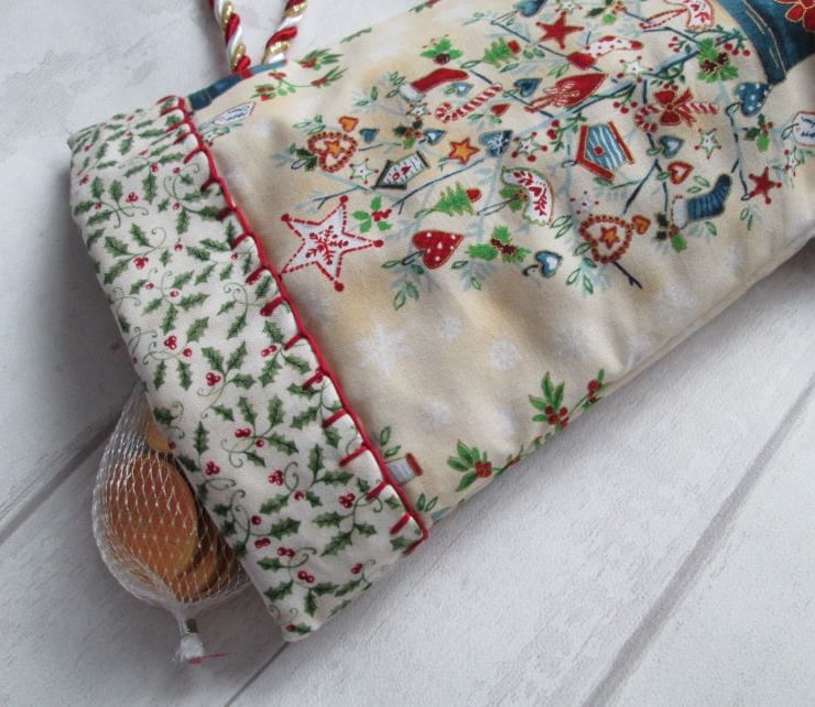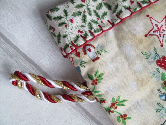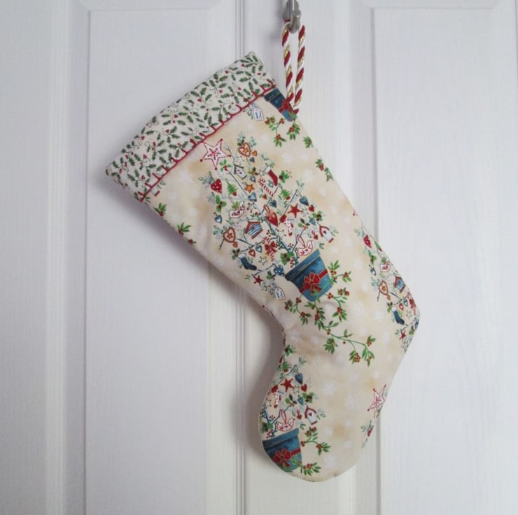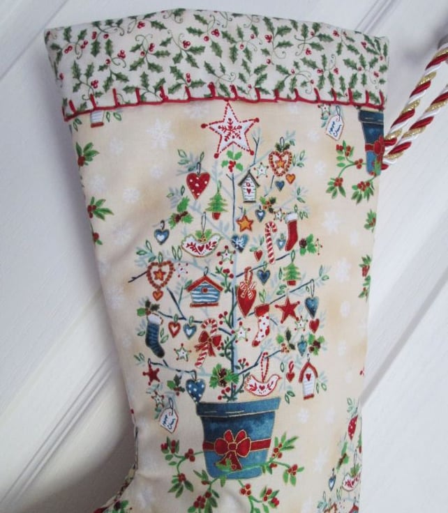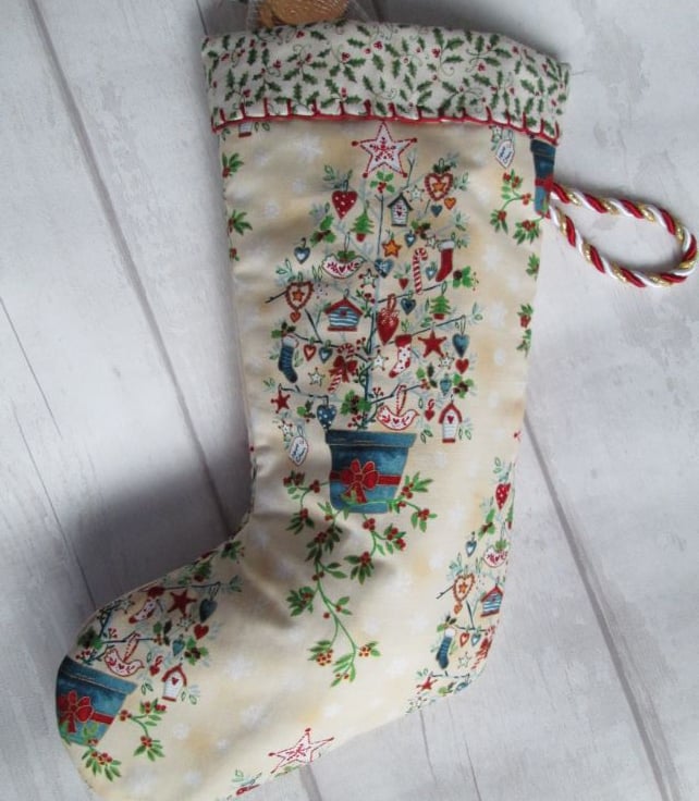 A fun Scandi style Christmas stocking in cream printed with large quirky Christmas trees. Lined with a ditsy holly print and finished with crimson blanket stich and a twisted cord hanging loop in red, white and gold, it would look equally at home on a traditional dresser or modern fireplace.