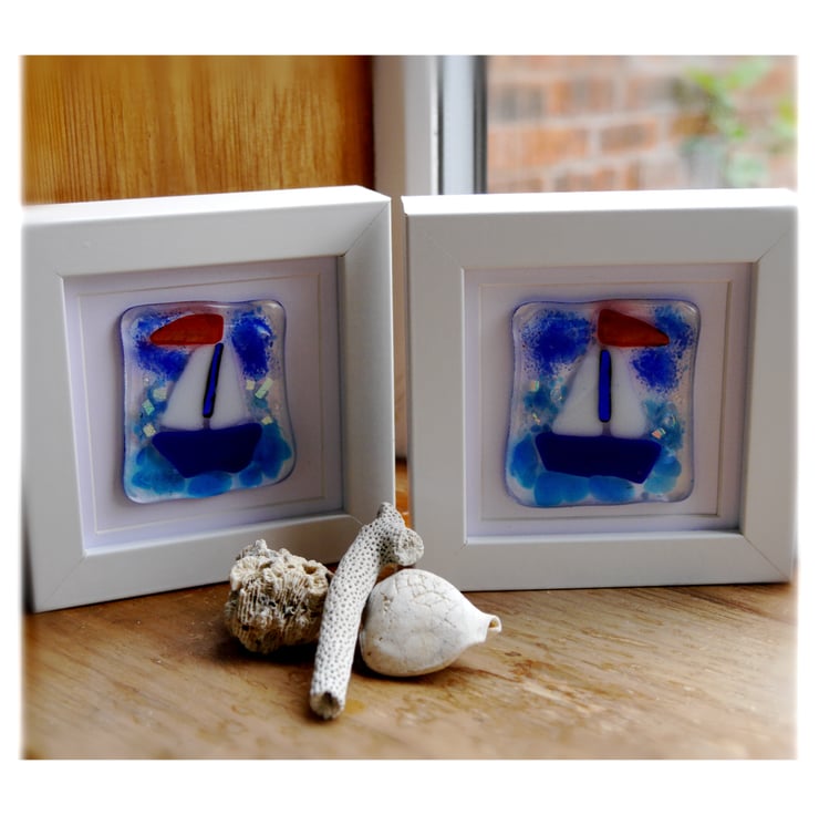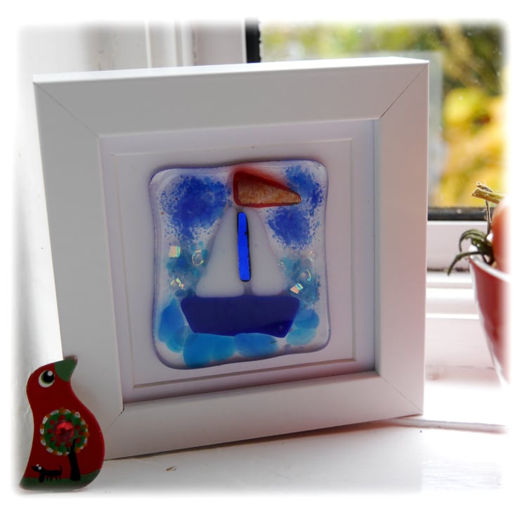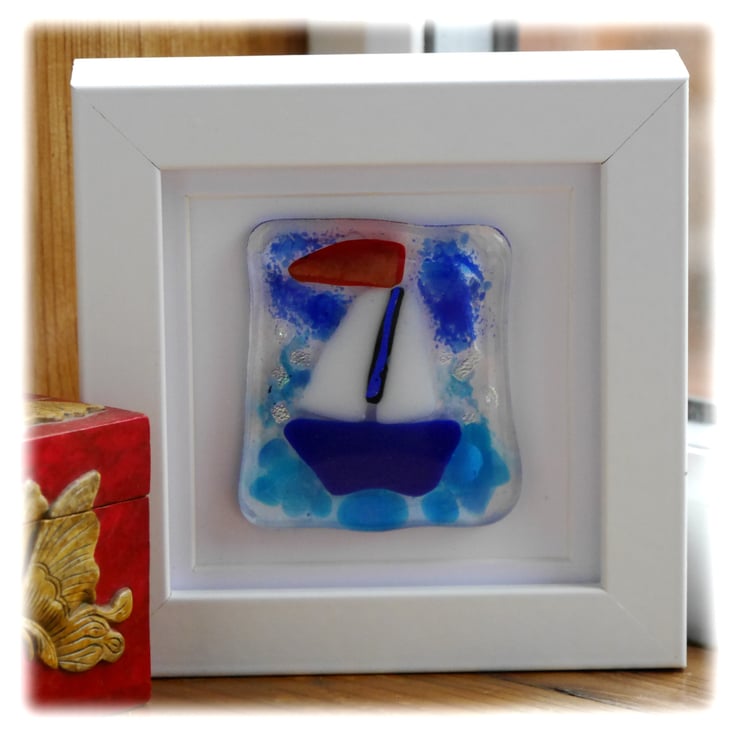 The fused boat pictures measures 6cm x 6.5 and is fitted at the back of a 12cm box frame.