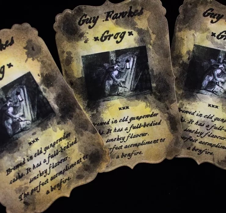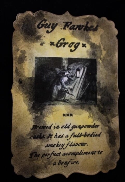 Each sticker has a picture of Guy Fawkes planting gunpowder. In the description it is written "Brewed in old gunpowder casks. It has a full-bodied smoky flavour. The perfect accompaniment to a bonfire".