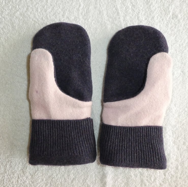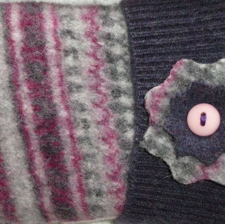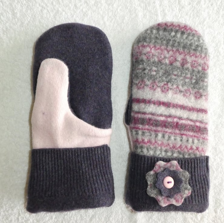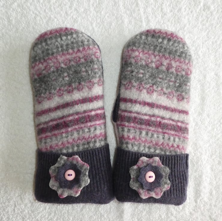 These warm and cosy winter mittens have been re-fashioned from up-cycled 100% wool sweaters. The jumpers have been washed and felted before cutting and stitching. A full lining for the mittens has been made from polyester polar fleece for warmth and comfort. A decorative felt flower with button center has been stitched to the cuff of the mittens.