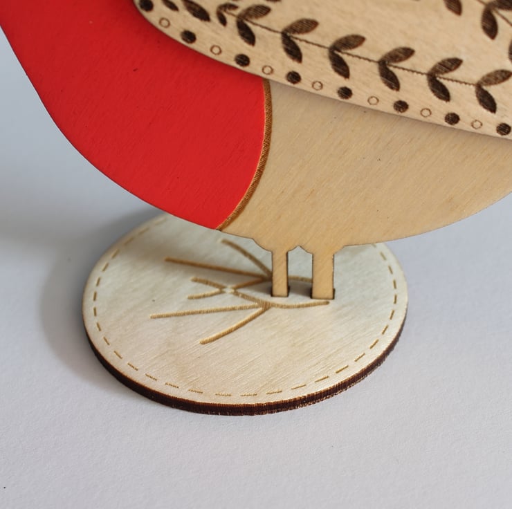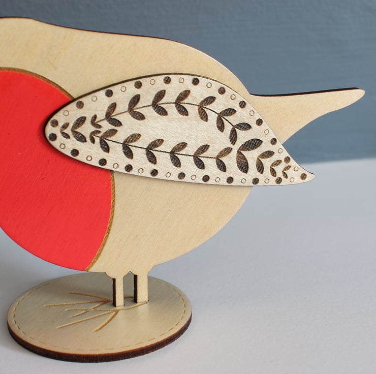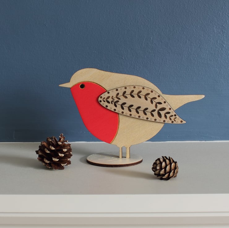 Cut from 3mm ply, he's hand painted and features a pretty leaf pattern, etched onto his wing. He's finished with a glossy varnish to keep him looking lovely.