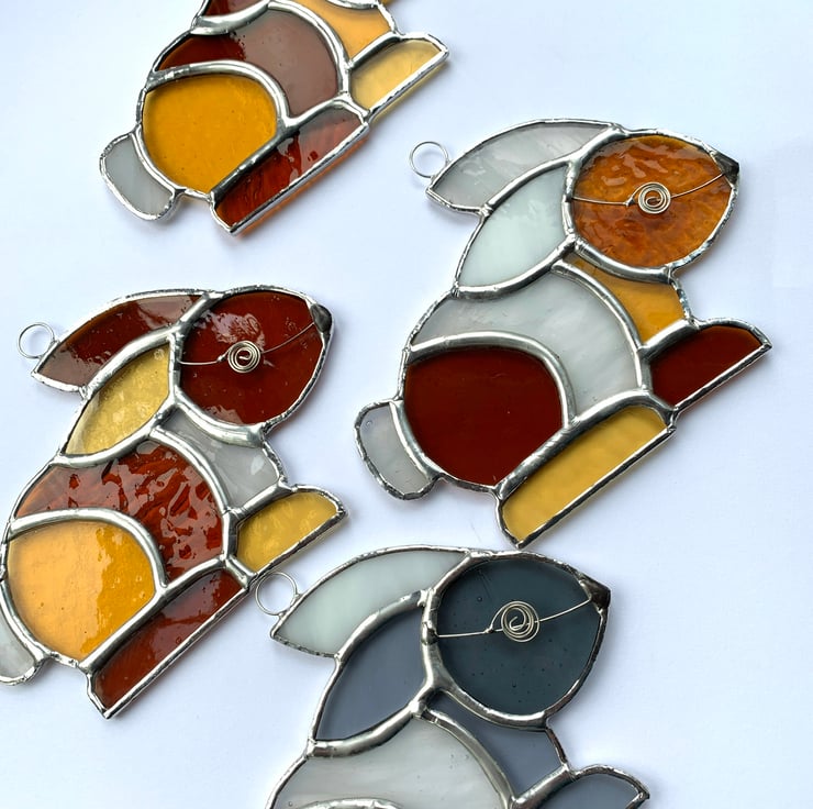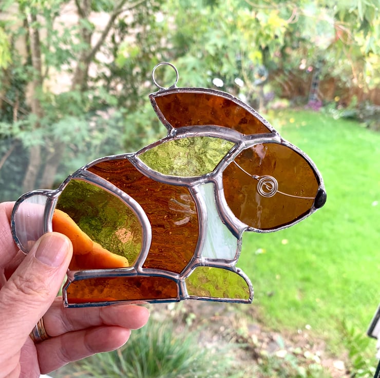 This particular rabbit has been made with different sides of amber and white stained glass. Each piece of glass has been hand cut, ground, foiled and soldered together bare being washed and polished.
