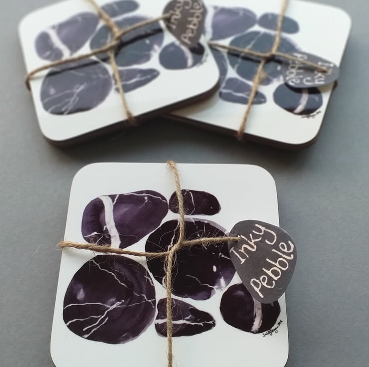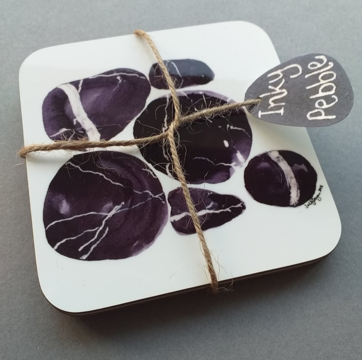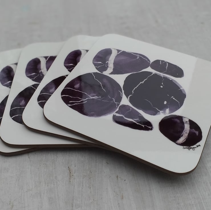 A pair of coasters printed from an original design of seashore pebbles. The coasters have been printed and made in the UK. Gloss finish with an easy wipe-clean surface, and wood-backed. Two matching coasters approx 9cm x 9cm with rounded edges, and 3mm thick. Wipe clean only.