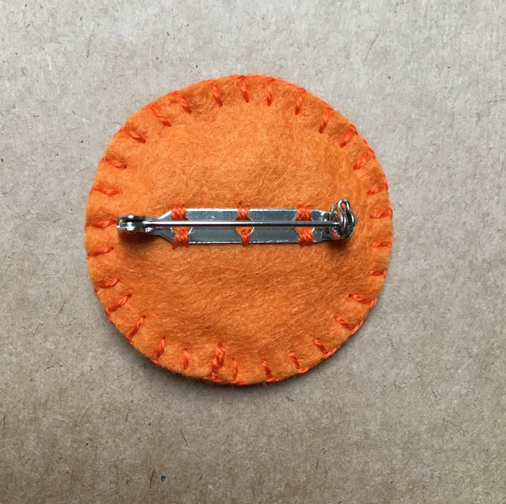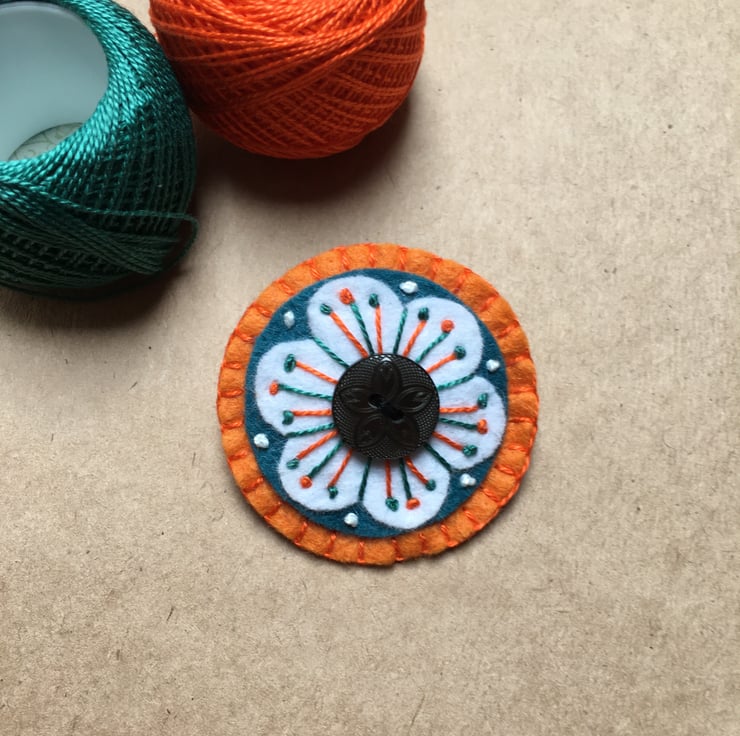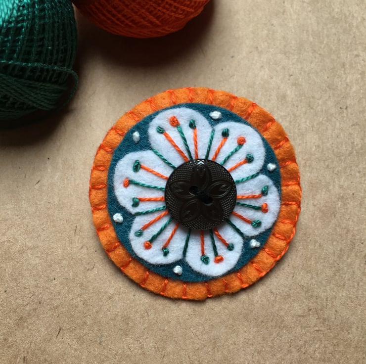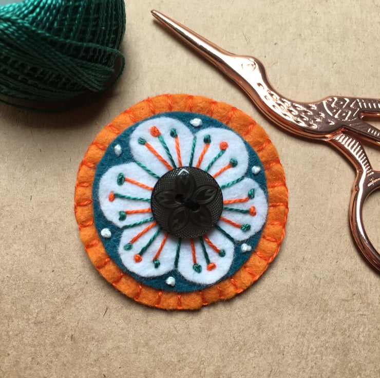 The brooch has been hand cut, stitched and embroidered using complimentary felt and embroidery thread colours and finished with a decorative button detail. It measures approximately 5cm in diameter.