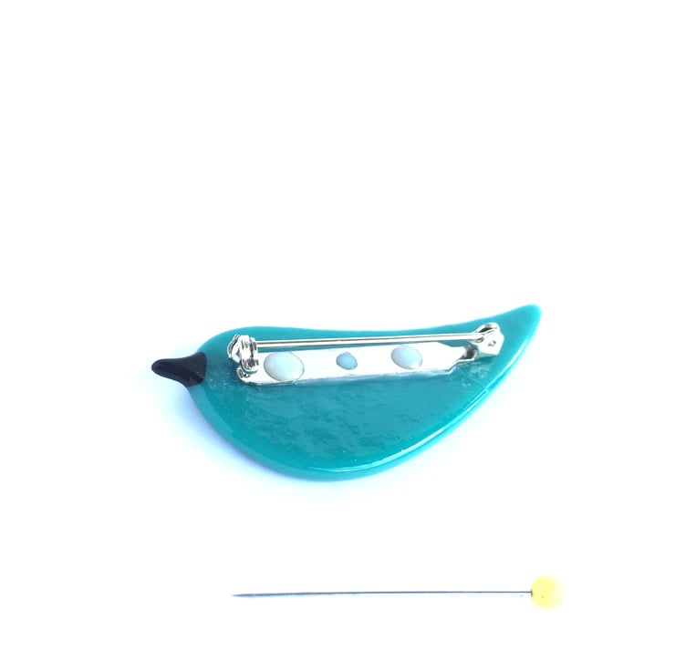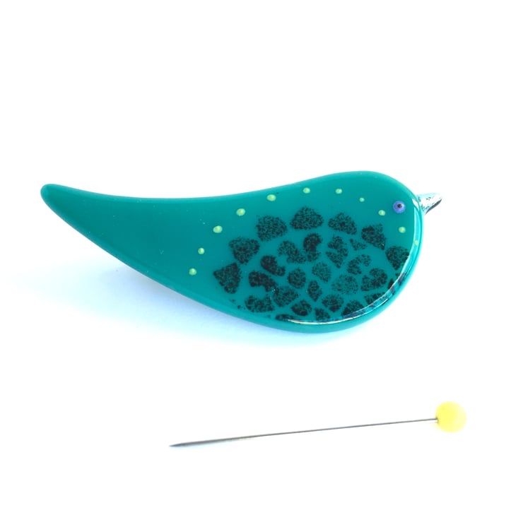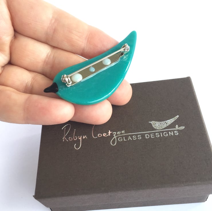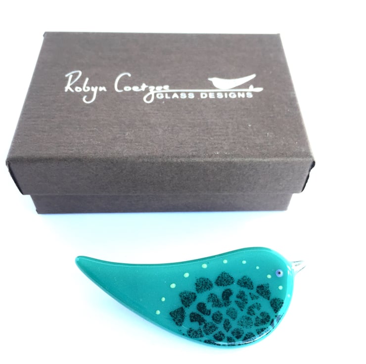 A lovely teal fused glass bird brooch with a little silver dichroic beak. It measures 6cm x 2cm and comes in a jewellery box with my logo on the lid.