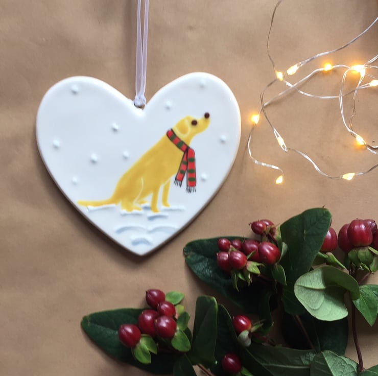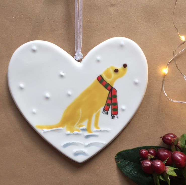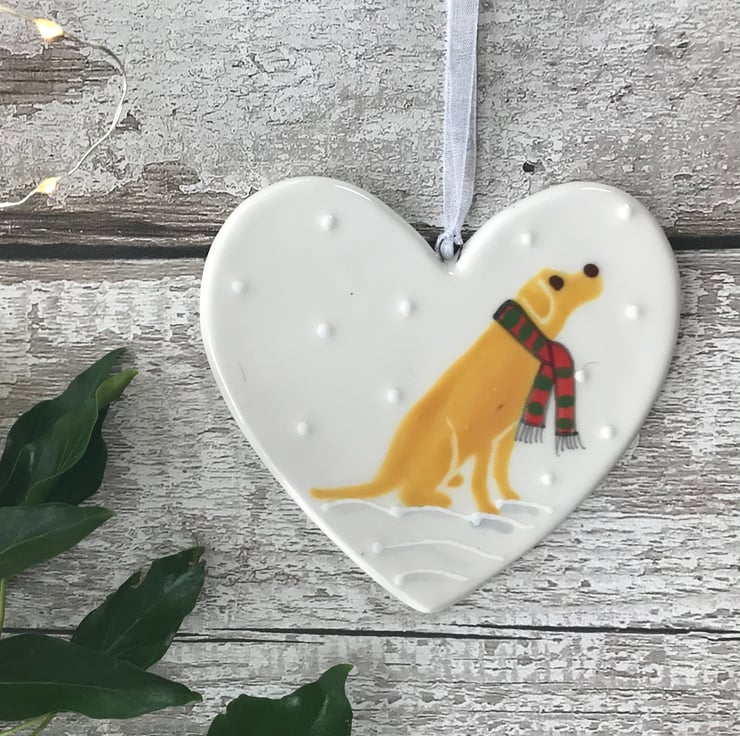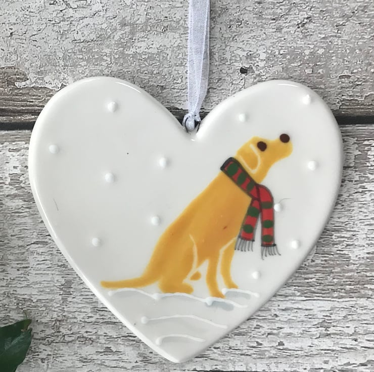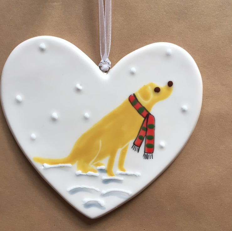Golden Labrador in the snow - Hand Painted Ceramic Heart