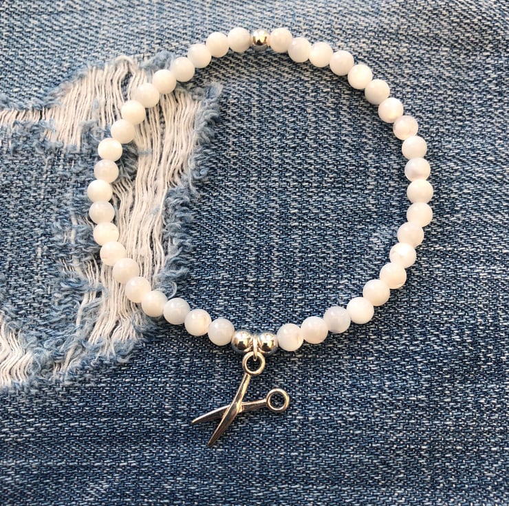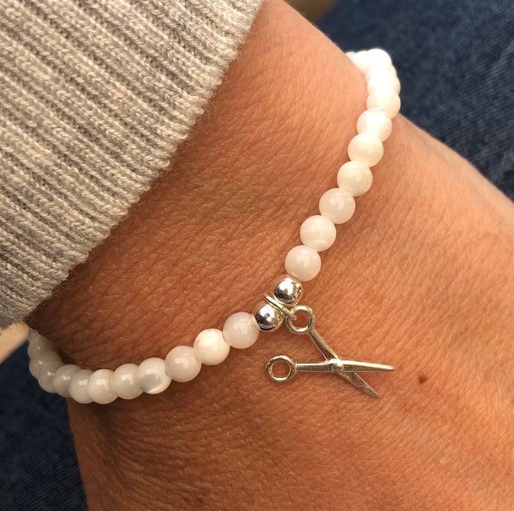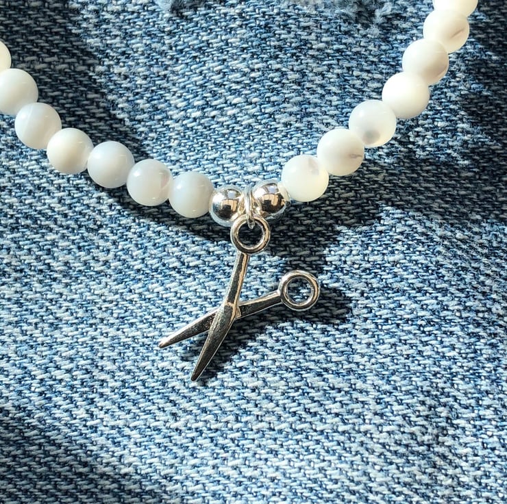 Made using mother of pearl beads sterling silver beads and a sterling silver scissors charm. Perfect for a hairdresser or seamstress.