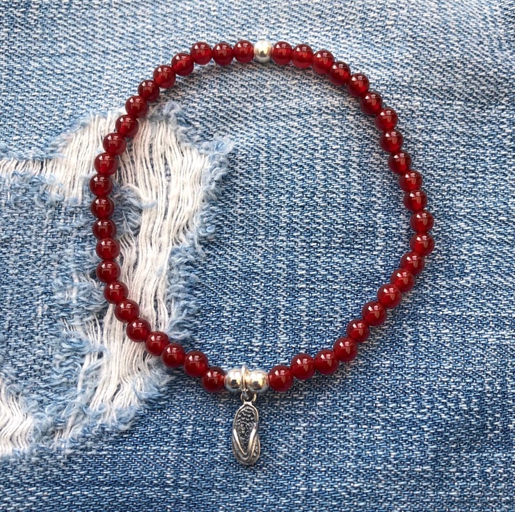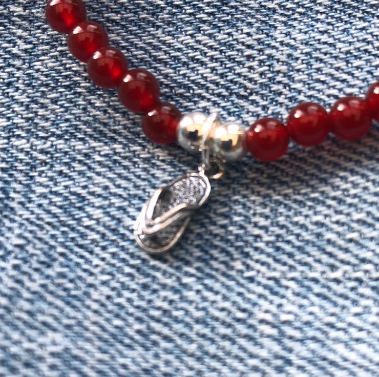 Made using 4mm red carnelian beads sterling silver beads and a sterling silver flip flop charm.