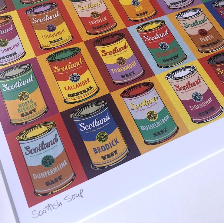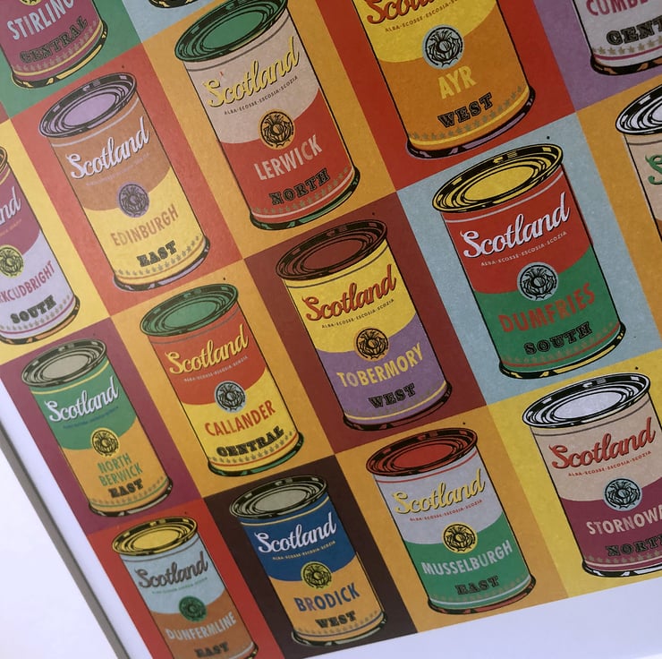 This vibrant, screen-print effect illustration includes thirty five areas of Scotland, including: