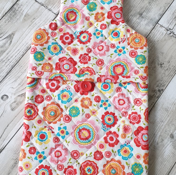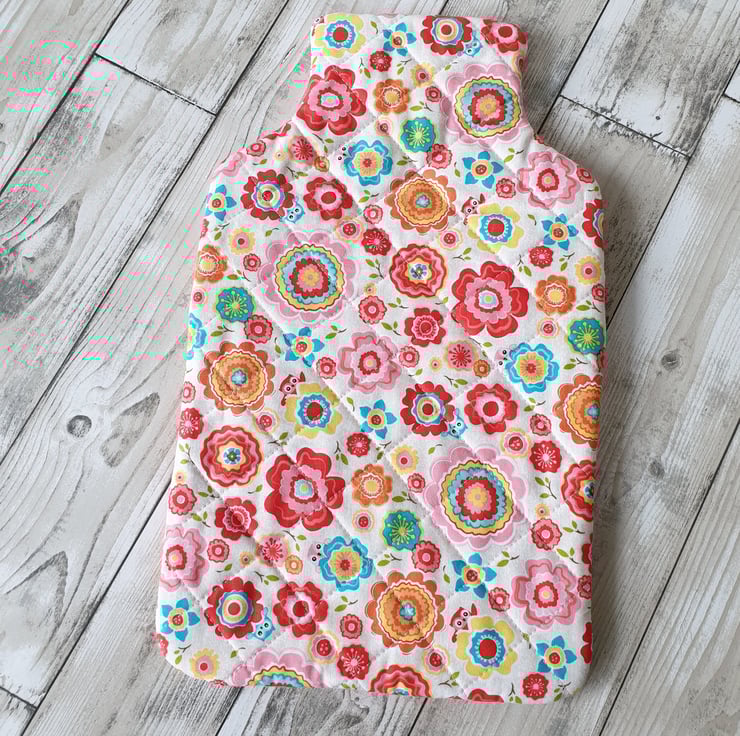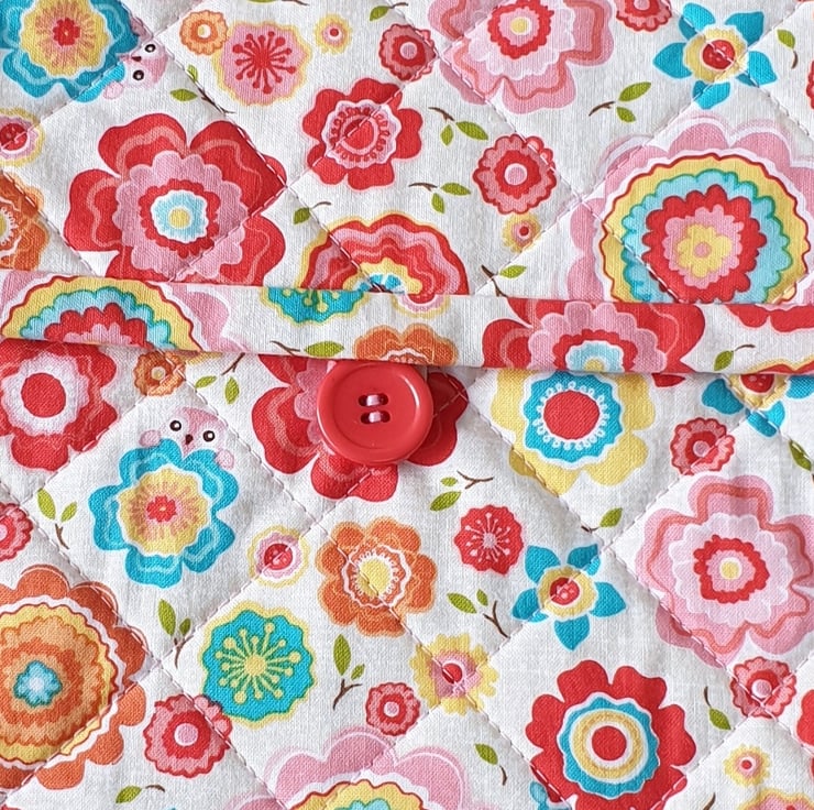 Made from cream coloured cotton fabric, covered with bright retro flowers with cute little owls peeking over some of the flowers. A layer of cotton wadding is sandwiched between the front and the brushed cotton lining. It is quilted using 100% cotton thread in a matching pale pink colour.