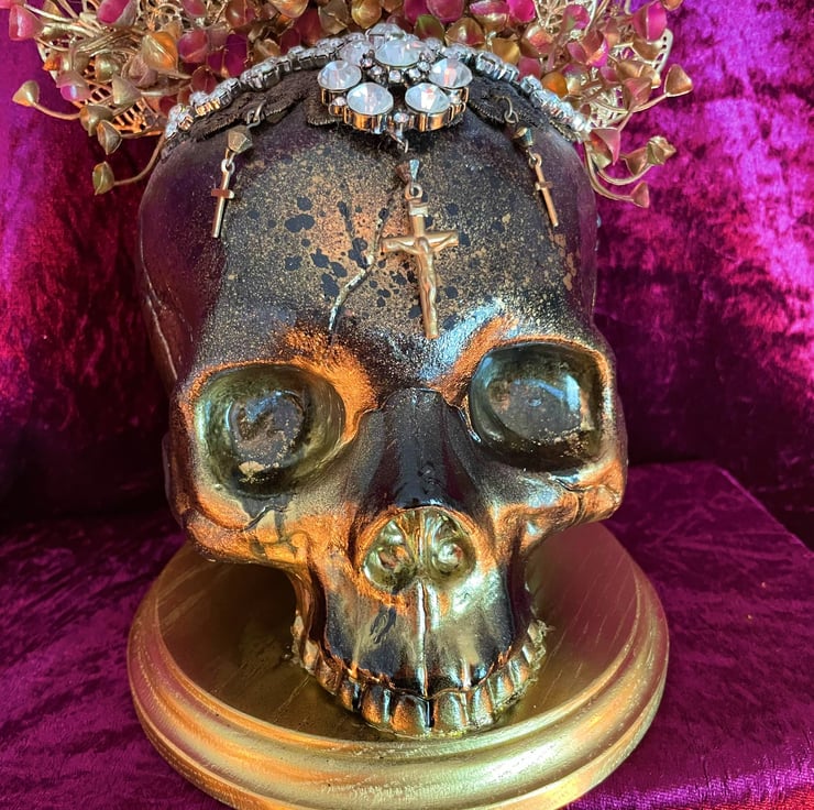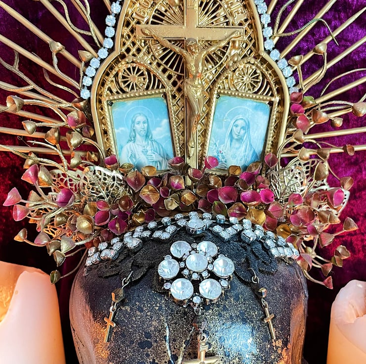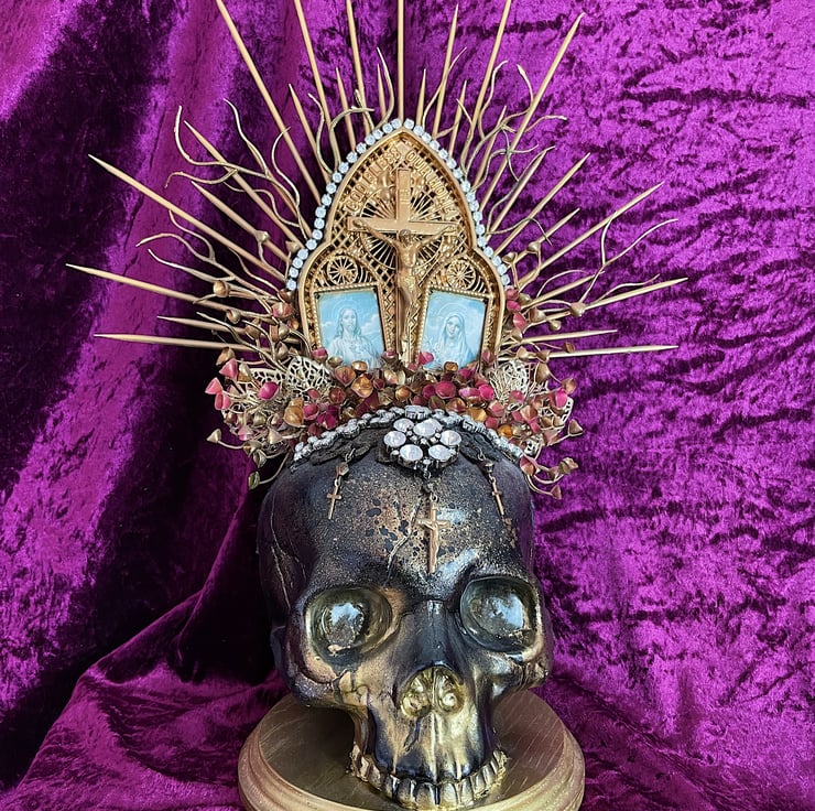 A unique, handmade memento mori gothic inspired skull sculpture, adorned with a religious kitsch shrine headpiece.