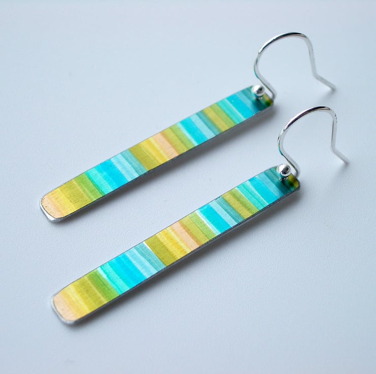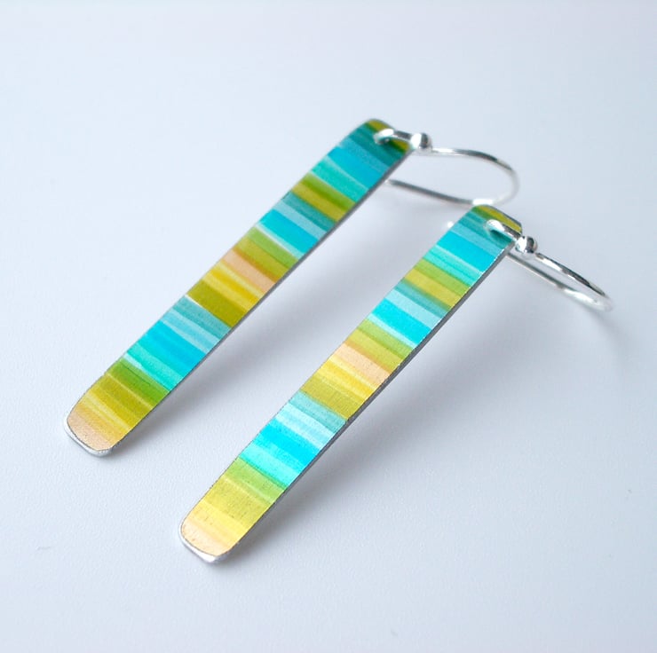 These simple yet eye catching earrings are made from aluminium which I have dyed in a cheerful mix of mix of turquoise and yellow. The dye is made permanent through heat. I cut the rectangles out by hand using a piercing saw and file the edges to give a smooth finish.