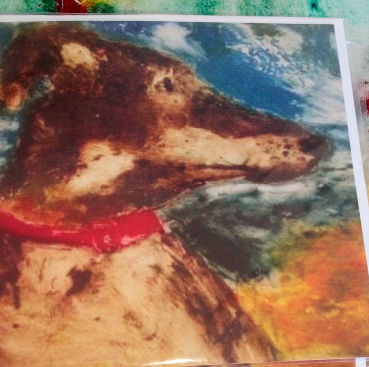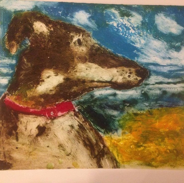 This is an example of a collagaph and is made with collage and glue and drawing into tile cement. This is then inked up when it is dried and is pressed with an etching press. I can also do paintings of your pet