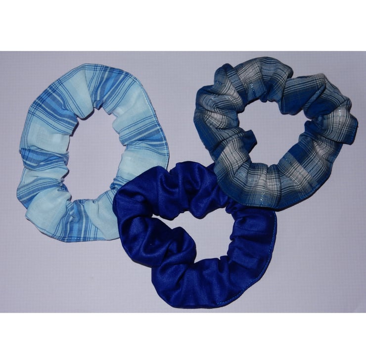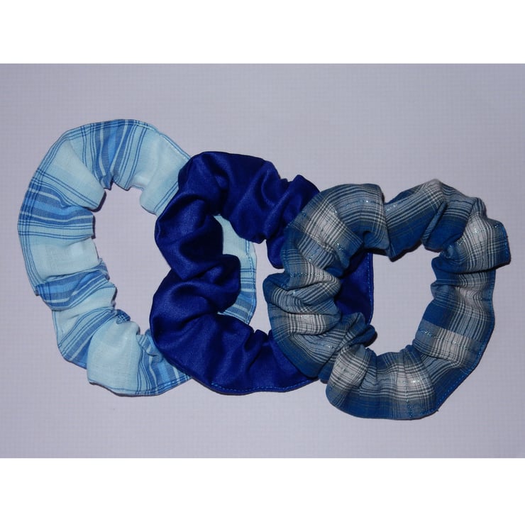 A set of three blue hair scrunchies, two in checked fabrics, and a plain blue with a little sheen to it. The darker check has a metallic accent. These are a generous size, and will fit two or three times around a pony tail or bun. The stretched length is approximately 20 inches.
