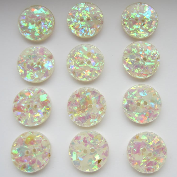 15 pretty sparkly plastic buttons, white on the back with the front decorated with what looks like tiny bits of coloured sparkly foil. They measure 23 mm across.