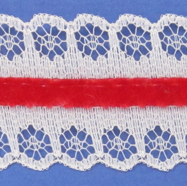 5.5 metres of 27 mm wide ivory lace with a red velvet strip.