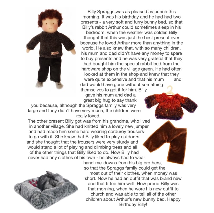 Mulberry Green is all about a time, now gone, but not so very long ago, when children had a great deal of freedom to explore their surroundings and use their imagination in play. A time when the world moved at a slower pace and things were made to last. To celebrate this heritage, wherever possible, I use traditional crafts and materials to create my dolls and outfits.