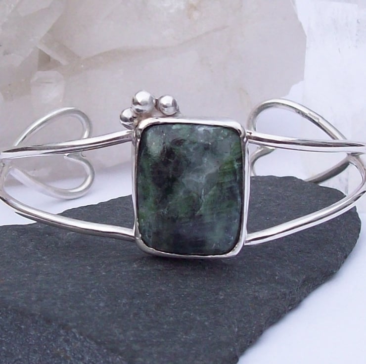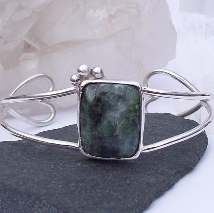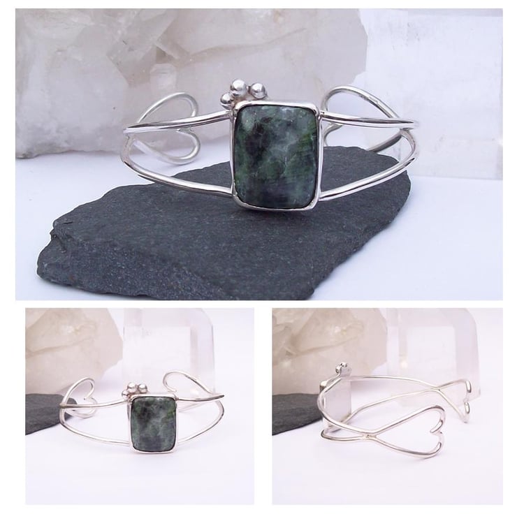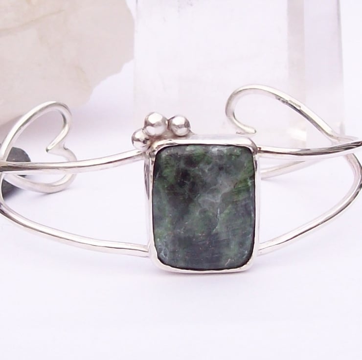 A stunning feature gemstone of Green Chrome Diopside in a oblong shape with silver balls on one corner of the setting take the stage in this solid sterling silver 925 cuff bangle, but thats not all, as the wire is a continual strand that runs around the cuff twice the ends of the bangle is shaped into a heart.