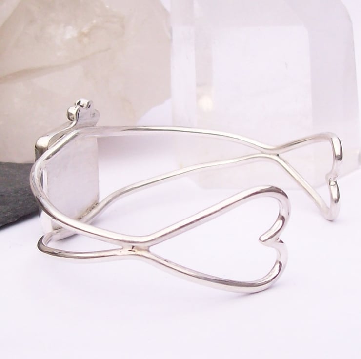 The wires of the cuff gradually taper to a joining point before faning out and creating a heart feature at the ends.