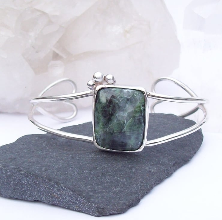 The cental feature is a 2 cm x 1.5 cm oblong cushion cut Crome Diopside Gemstone, in beautiful forest greens with gold flakes, set in a rub over setting with 3 ball solid beads detailing at one corner, total size of the seting is 2.5 cm x 2 cm, this is soldered onto the silver wire cuff at both sides..