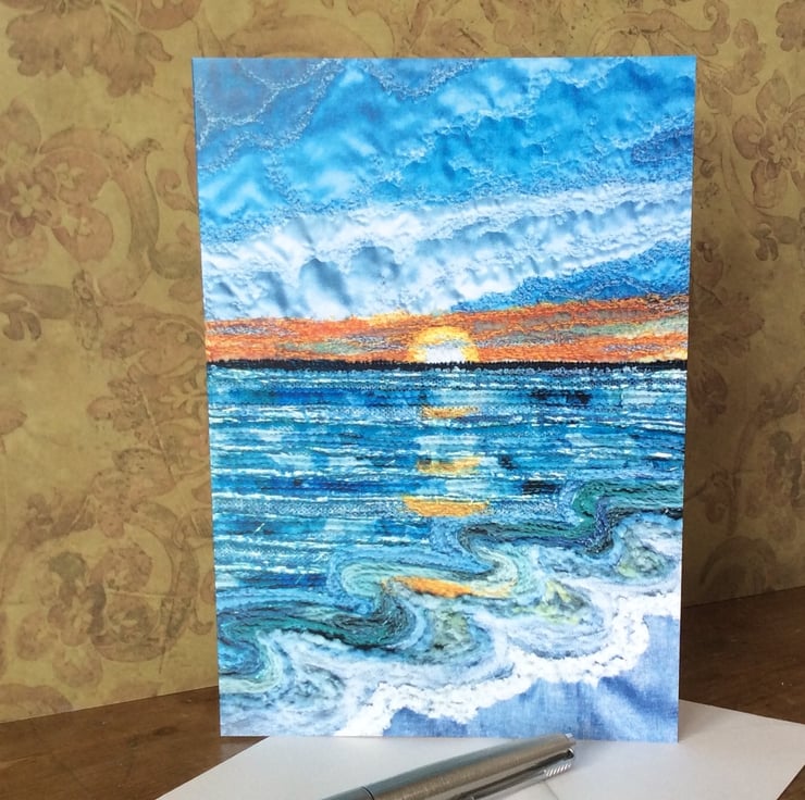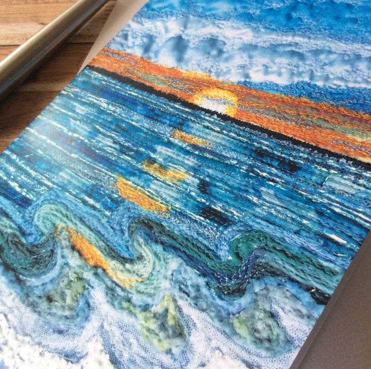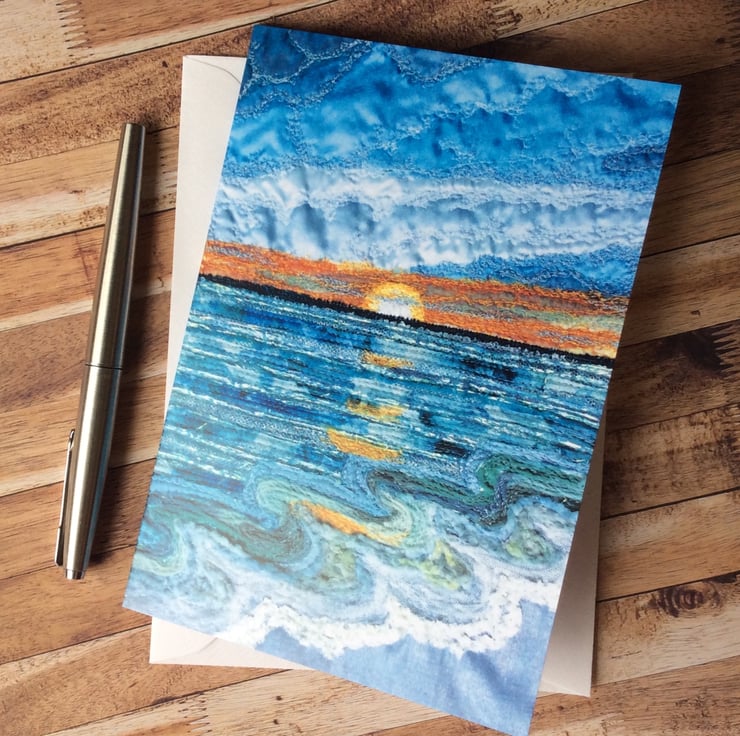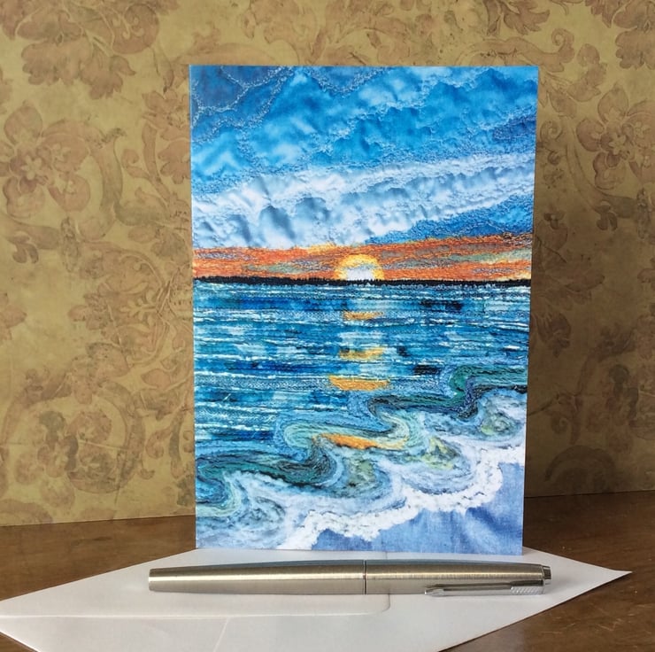 This card is a print of my free motion embroiderd landscape. This one captures the beauty of a sunset over the sea. The print has really captured the fabrics, texture and stitching. Ideal for any occassion. The card measures 12.5 x 18cm and it comes with a cream envelop in a plastic cover for protection.
