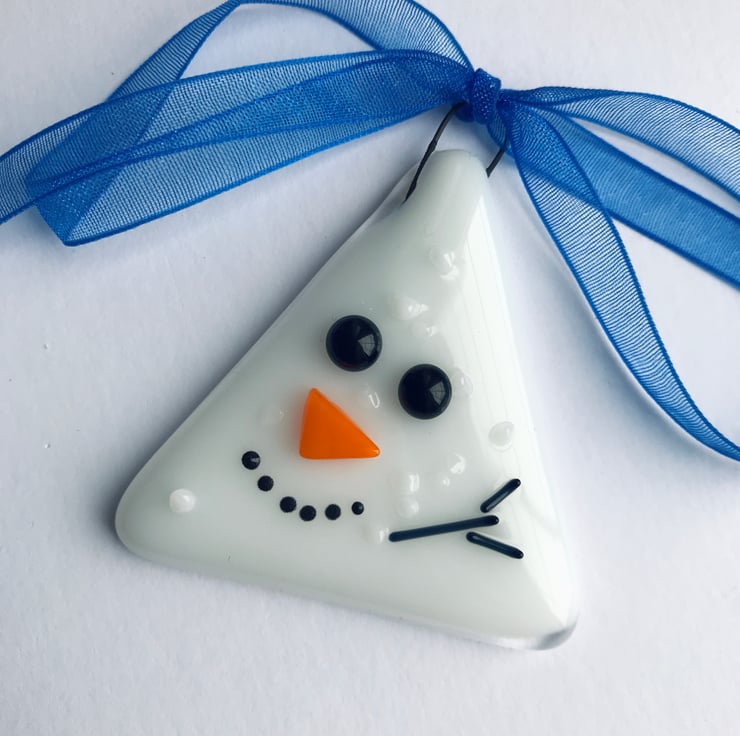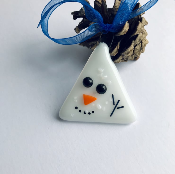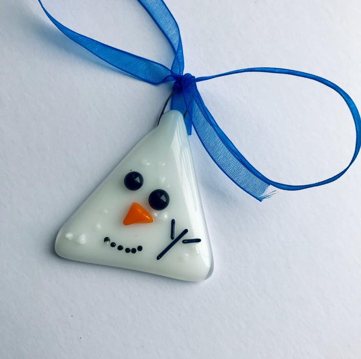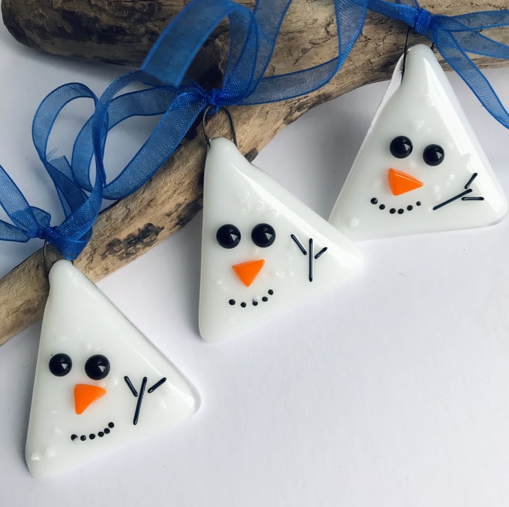 These small but so cute Christmas decorations are made from two layers of hand cut glass which is fully fused before I add the face details, of stones, twigs and carrot (or glass) and tack fuse. They measure 5 by 5cm.