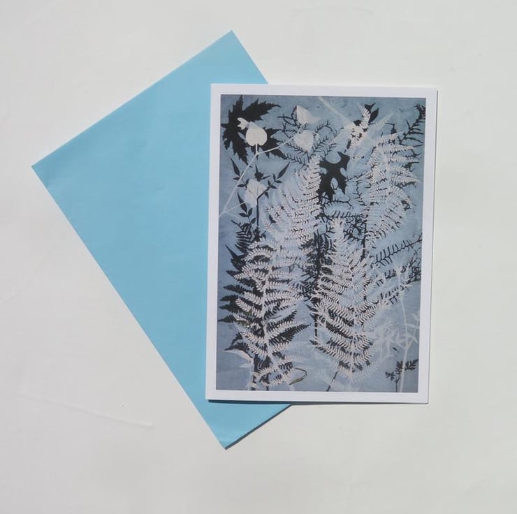 The original nature print from which this card has been reproduced was made with love, care directly using plants in the printing process. This design was made with ferns and foliage gathered from along the Yorkshire coast. All the inks on the original were mixed by hand on the plate to produce a unique colour - when printed over the initial black a whole range of subtle tones are created.