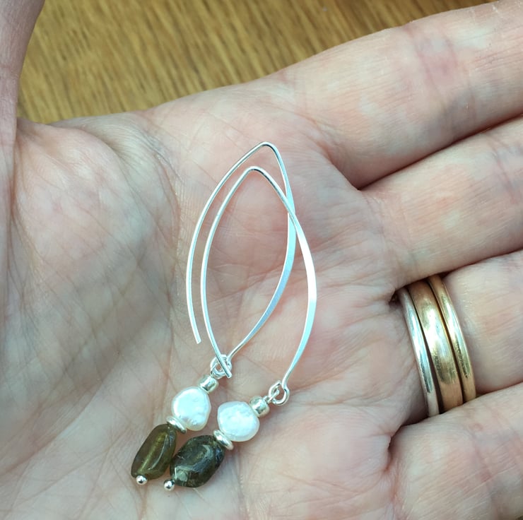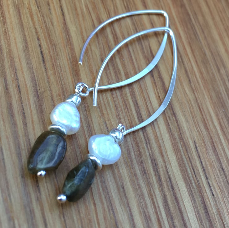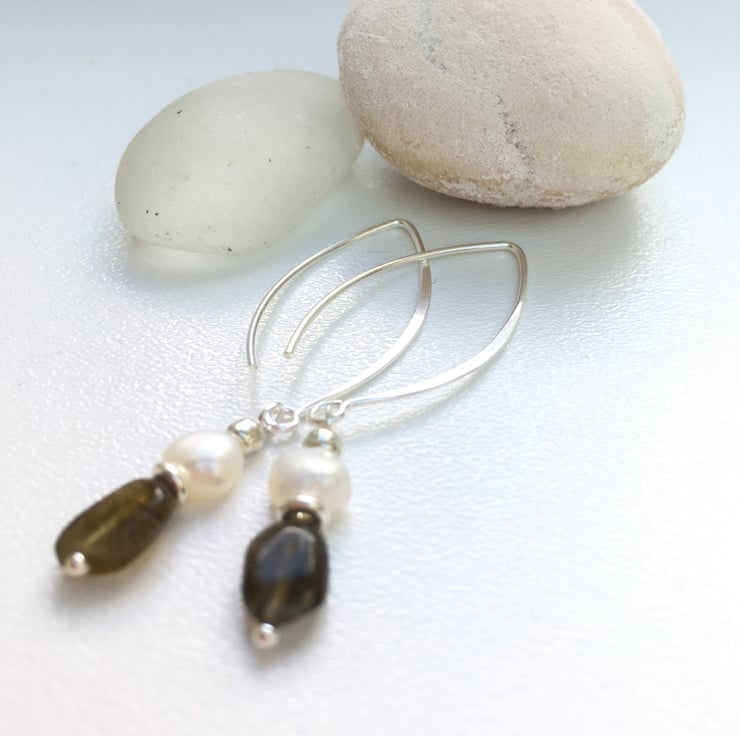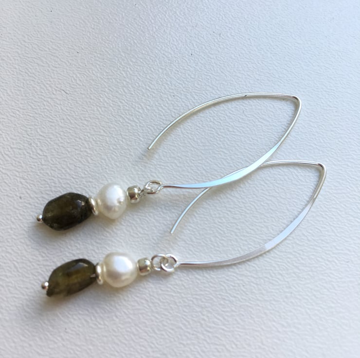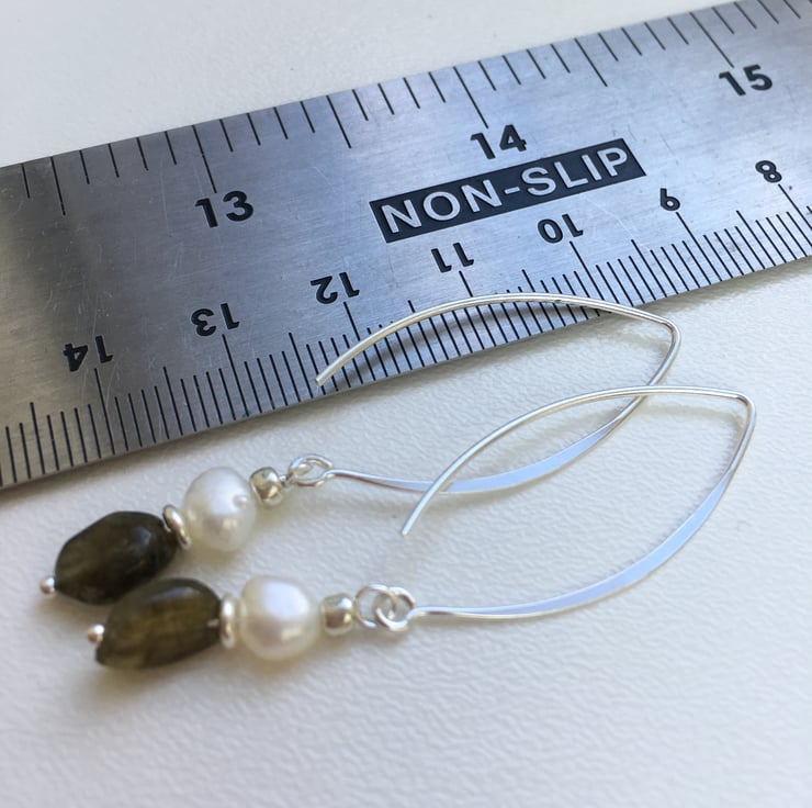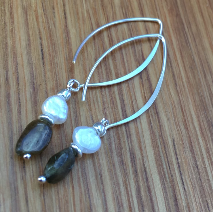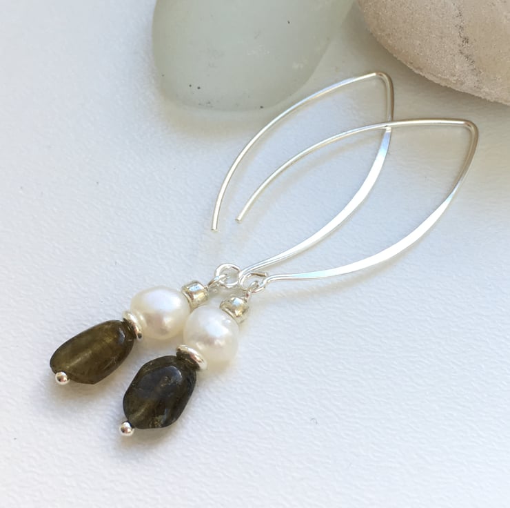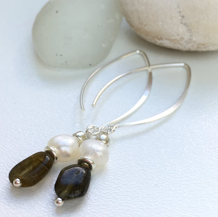 Labradorite Pearl Sterling Silver long earrings Handmade in England.