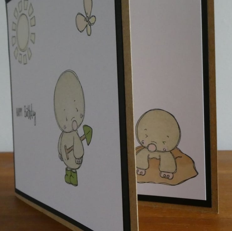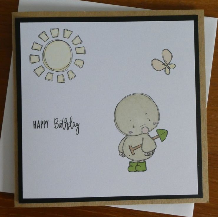 It is hand stamped and coloured with a cute mole in his green wellies carrying a spade, off to do his gardening on a bright sunny day with an orange and yellow butterfly for company. The greeting Happy Birthday has also been hand stamped.