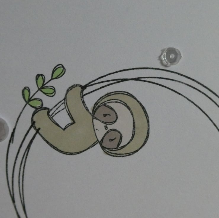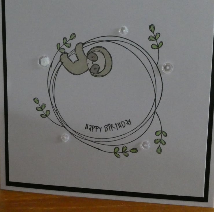 It features a sloth dangling in wreath decorated with leaves and clear sequins. Finished on the front with the greeting Happy Birthday it has been left blank inside for your own message.