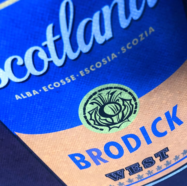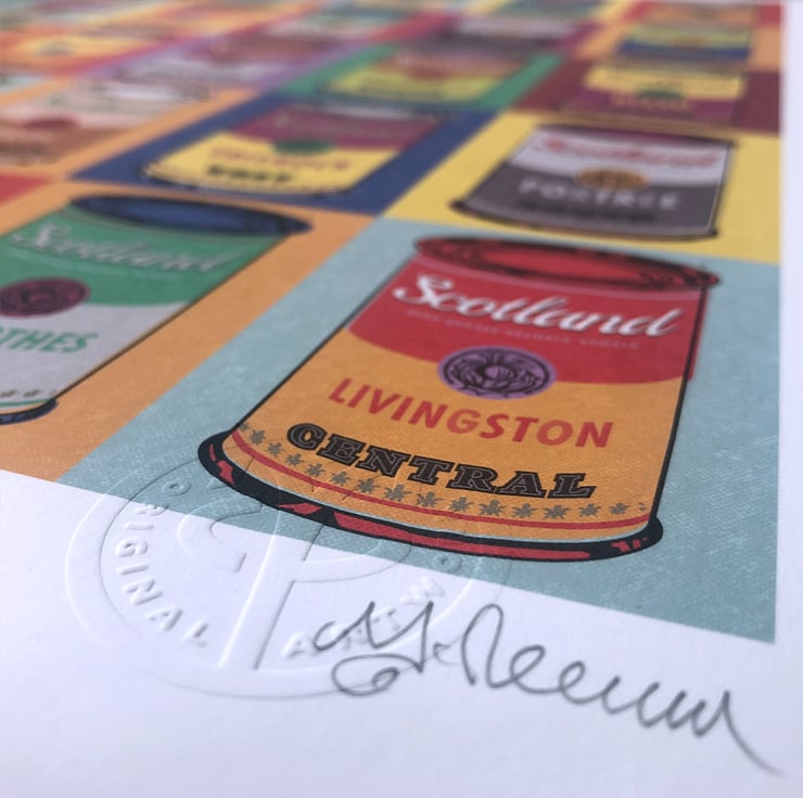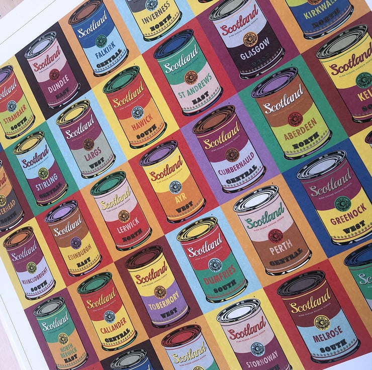 This vibrant, screen-print effect illustration includes thirty five areas of Scotland, including: